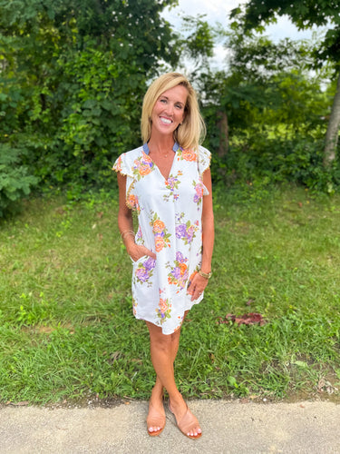 Cream Floral Flutter Pom Trim Sleeve Dress