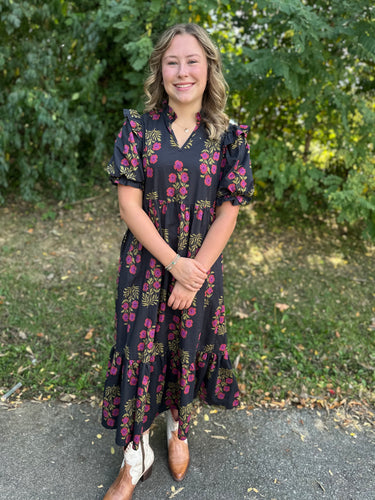 Navy Linear Floral Pattern Short Sleeve Ruffle Neck Dress