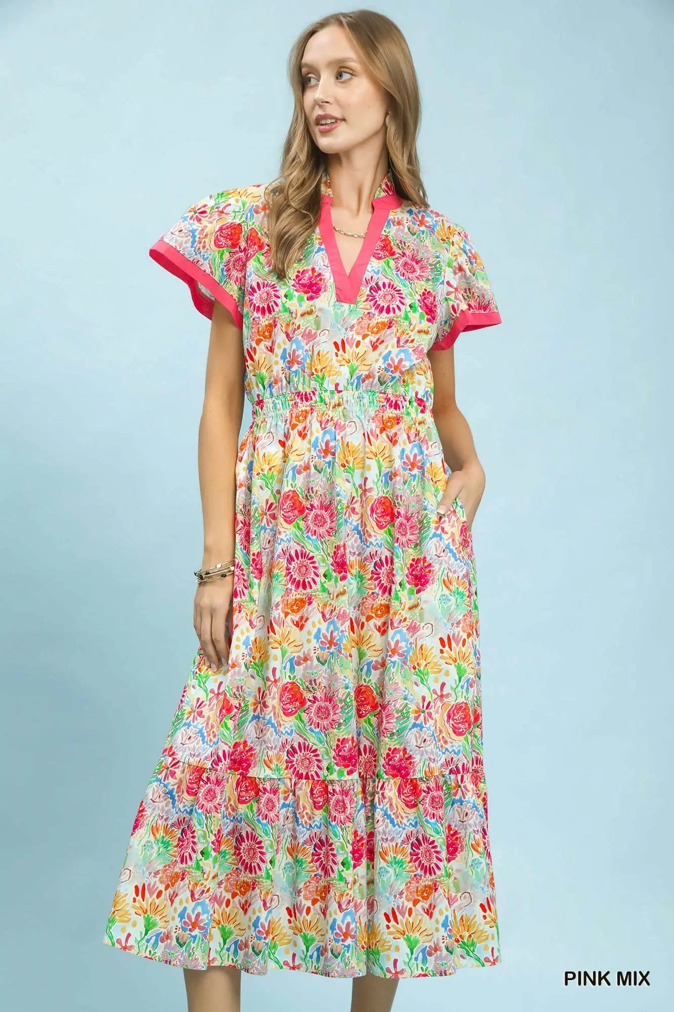 Elevate your wardrobe with this sophisticated midi dress, designed with thoughtful details that balance style and comfort. The tiered silhouette creates flattering movement, while practical side pockets add everyday functionality. An elastic waistline ensures a secure, comfortable fit, and the lined skirt provides coverage and structure. Short sleeves and a refined V-notch neckline offer a polished look, while contrast trim accents the design with visual interest. Perfect for transitional dressing, this piece works seamlessly from casual outings to more refined occasions.