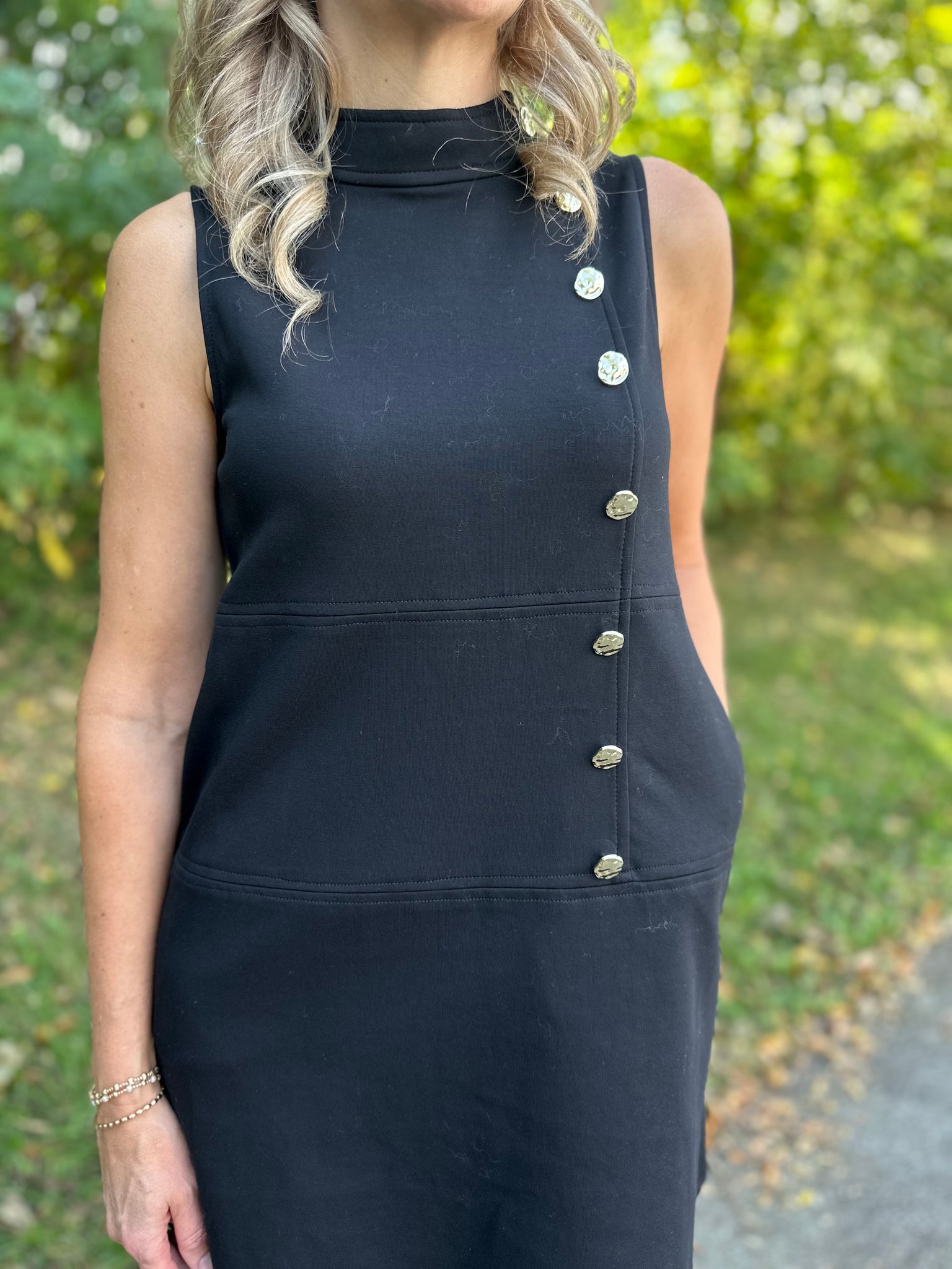 This black high neck dress features a sleek sleeveless design complemented by elegant button detailing along the neckline. Its refined silhouette offers a polished and sophisticated look, perfect for formal occasions or professional settings. Crafted to blend style with comfort, this dress stands out for its minimalist yet striking aesthetic.