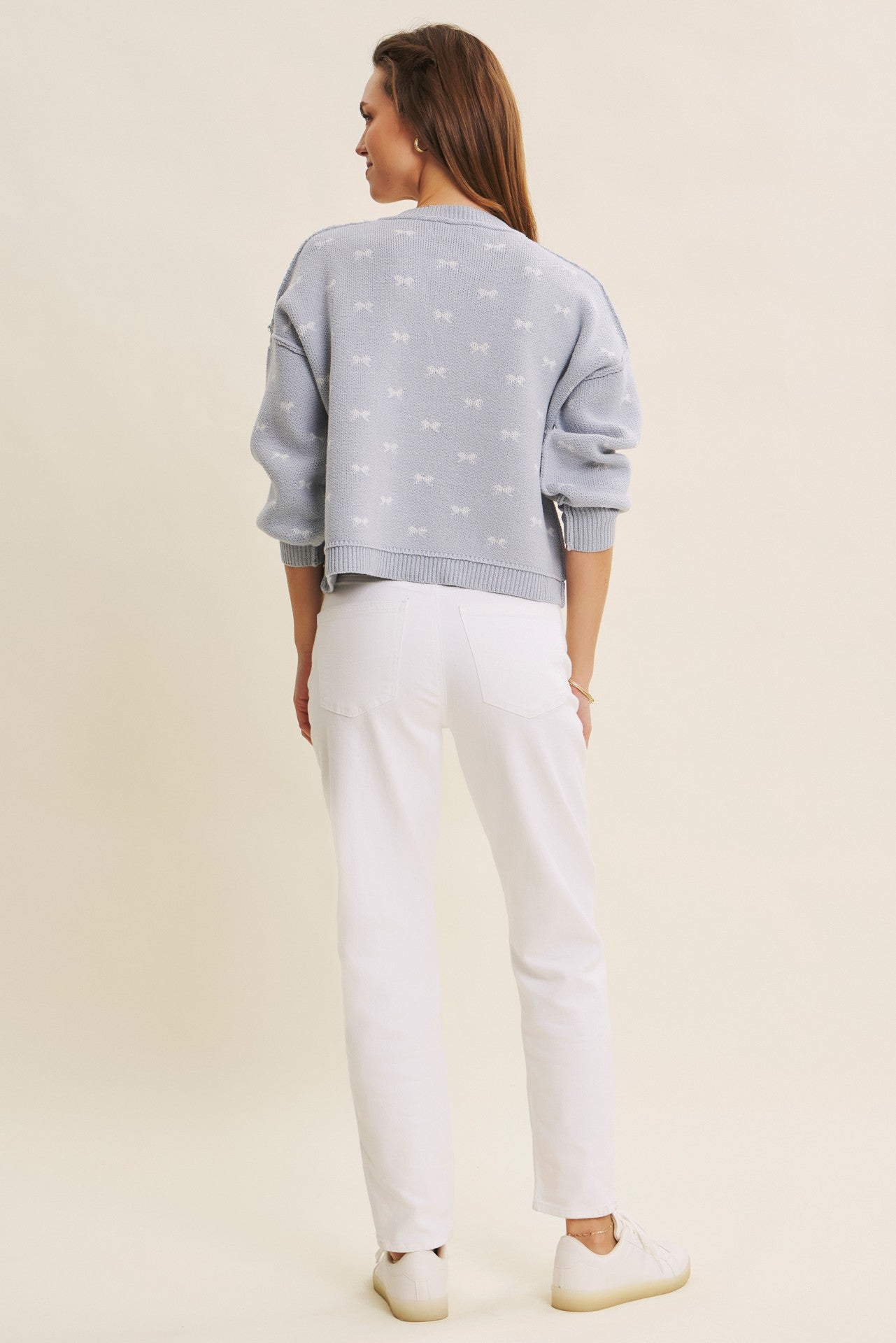 This Bow Jacquard Balloon Sleeve Sweater offers a refined blend of texture and silhouette, featuring a soft jacquard knit fabric with elegant bow patterns. Designed with a round neckline, ribbed trims, and distinctive balloon sleeves, it provides both comfort and a flattering shape. The exposed seam detail adds a subtle modern touch, making it an excellent choice for sophisticated fall layering.