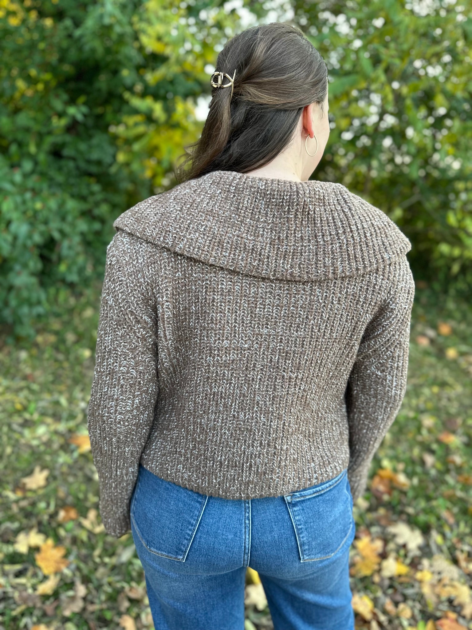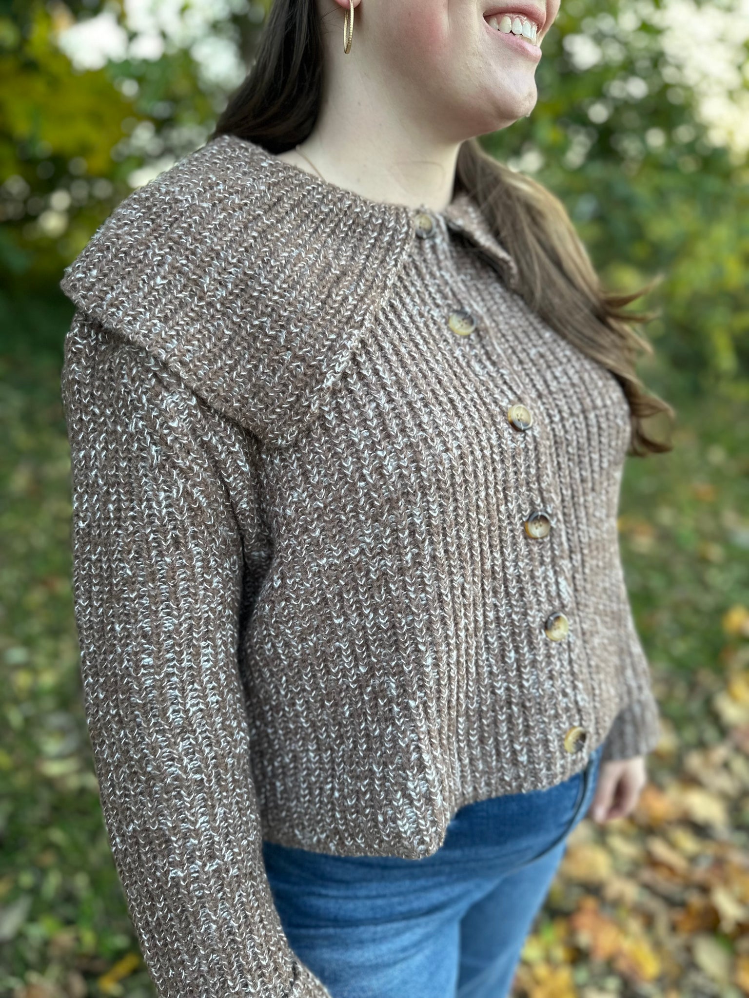This brown cropped cardigan features a knitted collar that adds a refined touch to its cozy design. Its shorter length creates a modern silhouette, perfect for layering over high-waisted pieces. Crafted for both comfort and style, this versatile piece provides warmth without bulk, making it ideal for transitional seasons or layering in cooler weather.