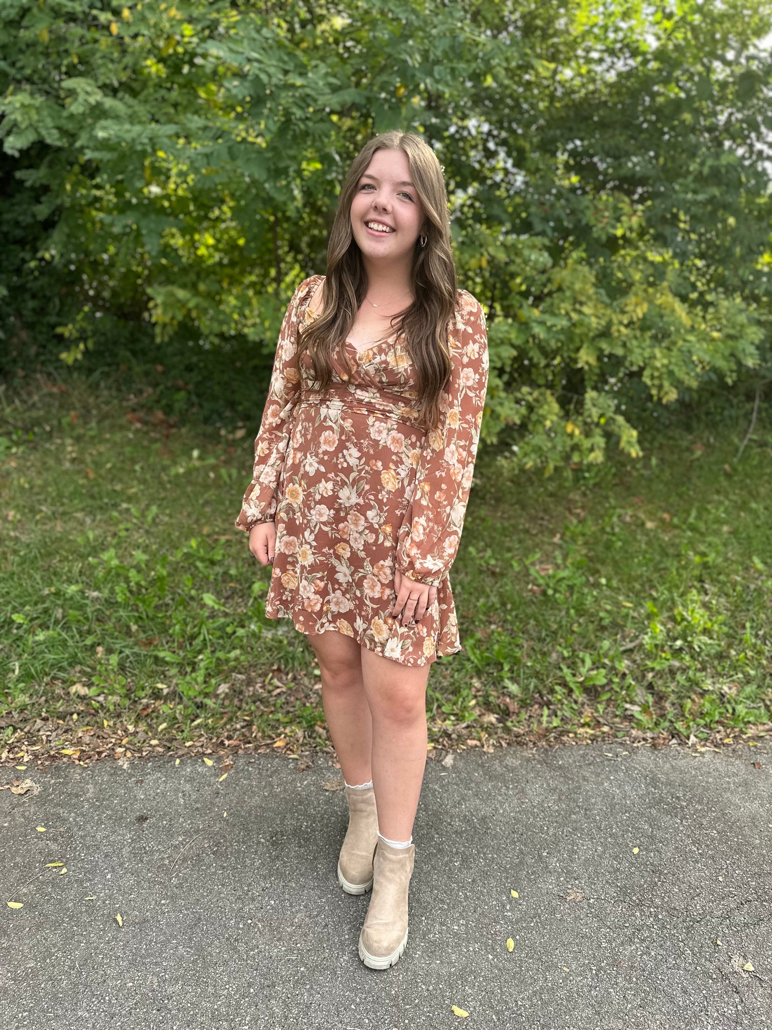 This Brown Floral Long Sleeve Dress combines timeless elegance with comfortable wearability. Crafted with a delicate floral pattern, it offers a refined look suitable for various occasions. The long sleeves provide added coverage and versatility, making it ideal for transitional weather. Its tailored fit enhances silhouette definition while maintaining ease of movement. Perfect for those seeking a sophisticated yet effortless style.