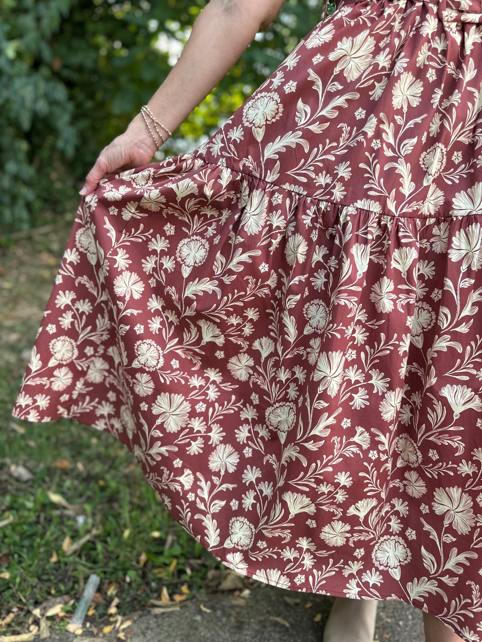 This Burgundy Floral Square Neck Midi Dress combines classic design with modern comfort. Featuring a flattering square neckline and delicate puff sleeves, it offers a timeless silhouette. The tiered A-line skirt adds graceful movement, while the self-belt cinches the waist for a tailored fit. Smocking at the back ensures flexibility, and side pockets provide practical convenience without compromising style. Ideal for both casual and dressier occasions, this dress blends elegance with everyday ease.