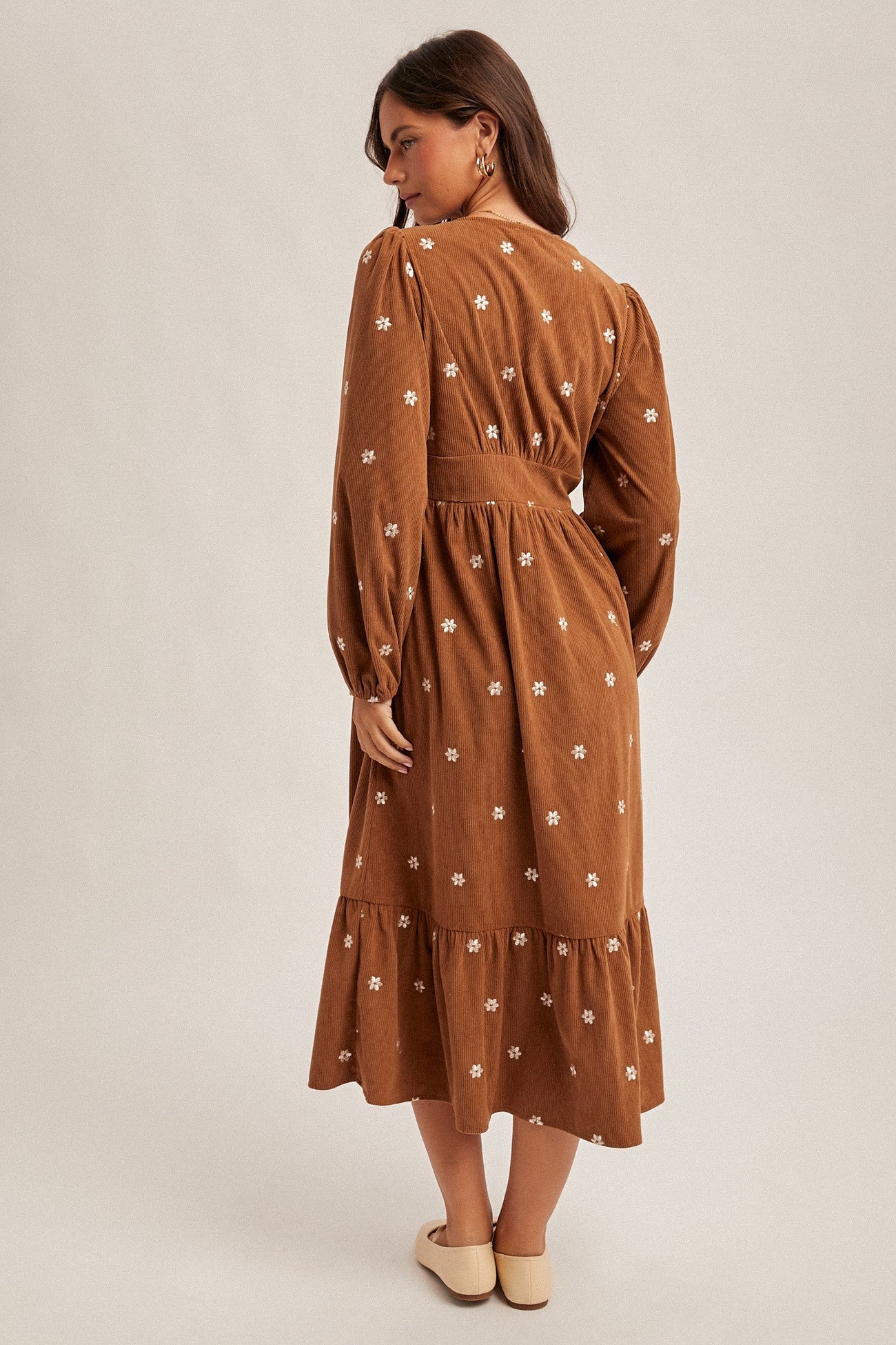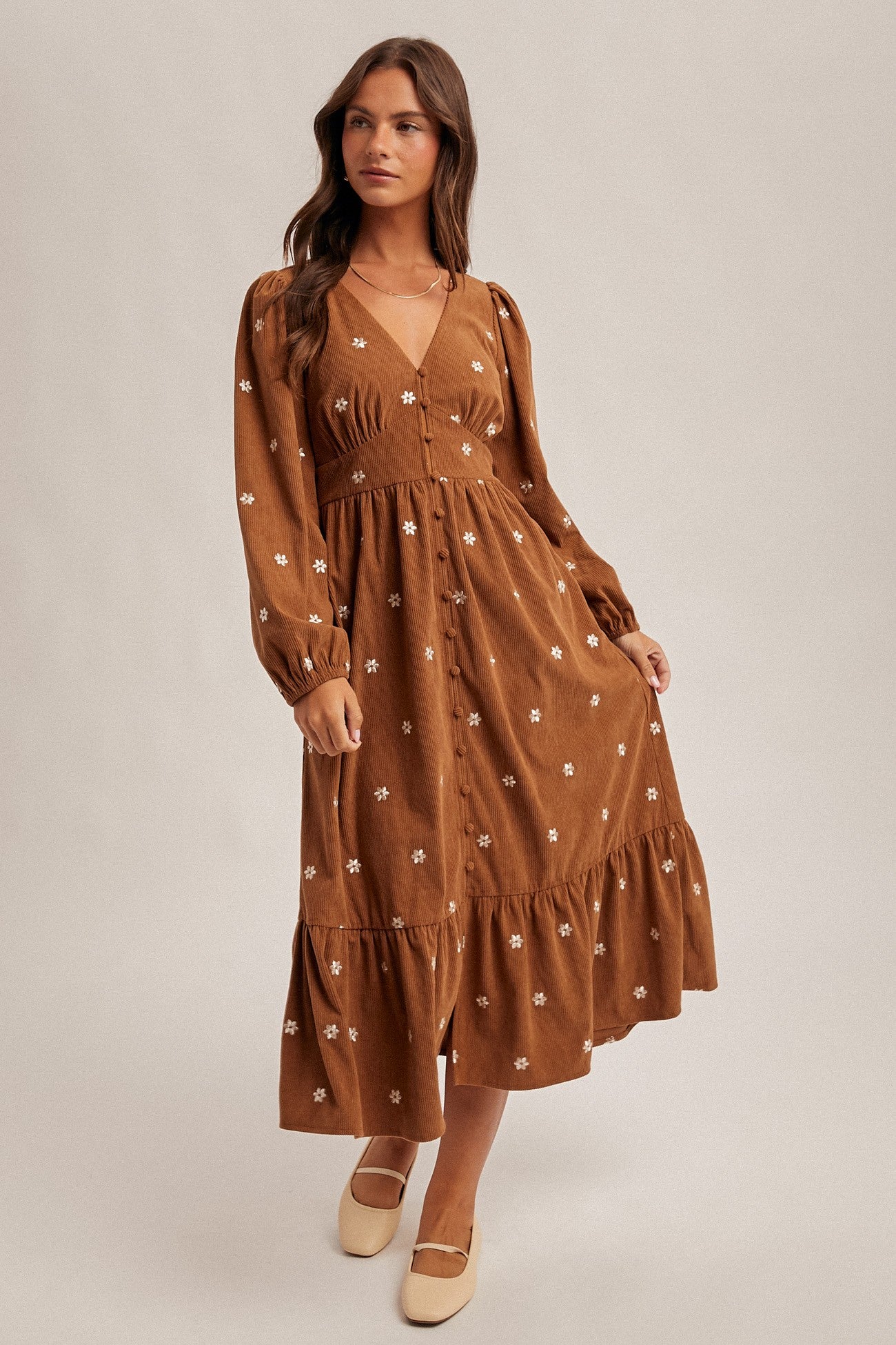 Elevate your wardrobe with this Button Down Embroidery Corduroy Midi Dress, featuring delicate floral embroidery that adds refined detail to its classic button-down design. Crafted from soft, durable corduroy, this midi-length dress offers both warmth and structure, ideal for transitional seasons. The tailored fit combined with easy-to-wear buttons provides effortless style and comfort suitable for professional or casual settings.