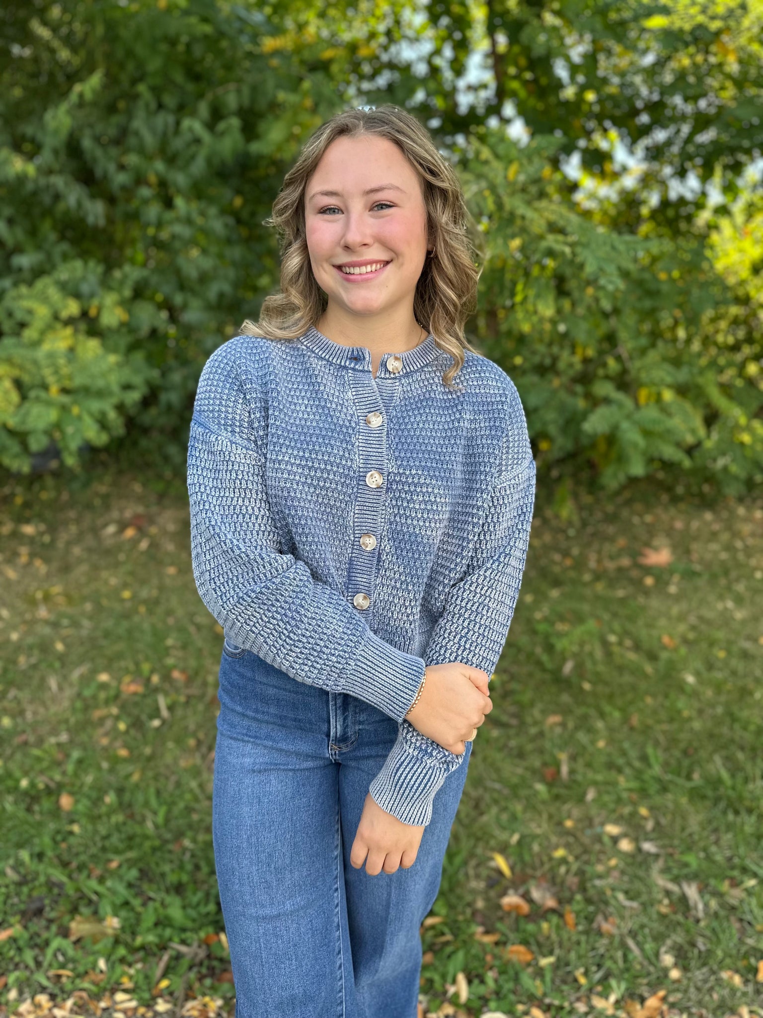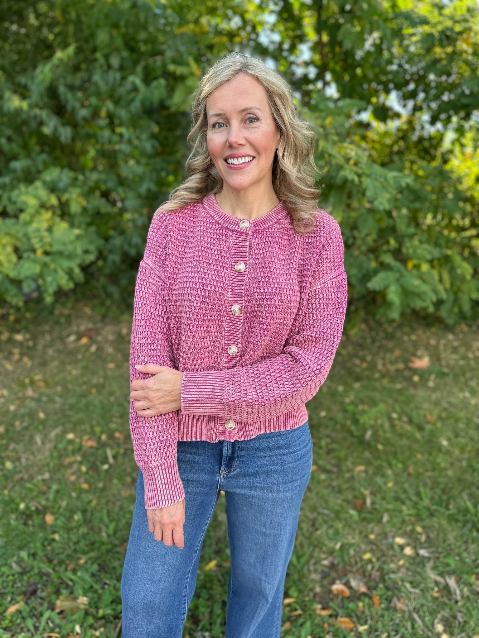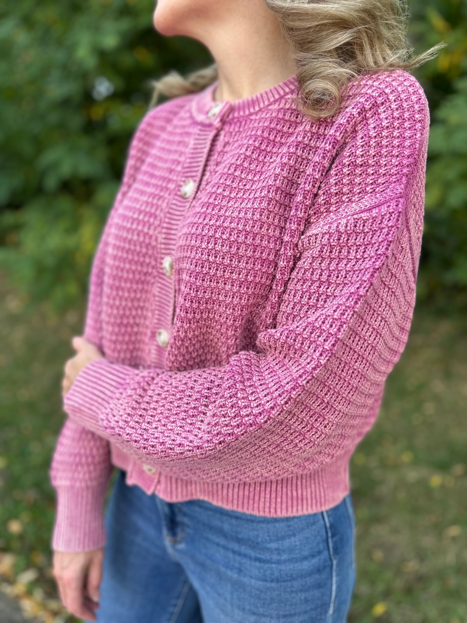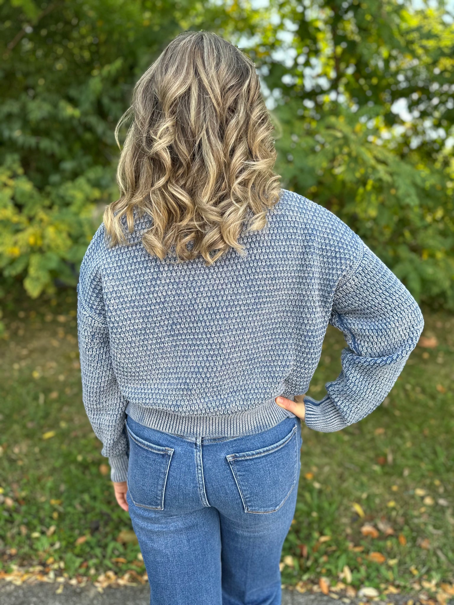 This cropped mineral-washed cable knit sweater features long sleeves and a button-down front, offering both style and function. Its textured knit provides warmth and comfort, making it an ideal layering piece that adds depth to any outfit while maintaining a refined, casual look.