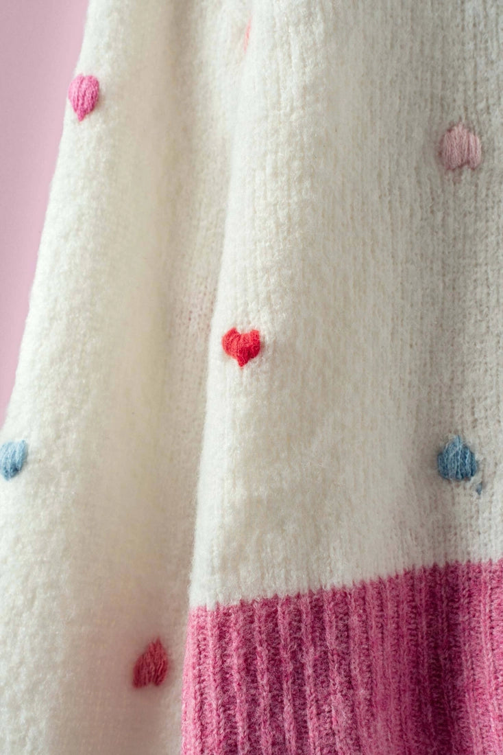 A cozy, soft-knit sweater gets a playful update with this charming piece. It features all-over, multi-color embroidered hearts and a whimsical colorblock design on the ribbed trim, making it a sweet and cheerful statement. Material: A soft, fuzzy knit blend for a plush and cozy feel. Design: An ivory-based pullover featuring all-over, multi-color embroidered hearts. Fit: A comfortable, relaxed silhouette with a classic crew neckline and dropped shoulders. Details: Features a unique, multi-tone colorblock design on the pink collar, pink hem, and mismatched tan and lavender cuffs.