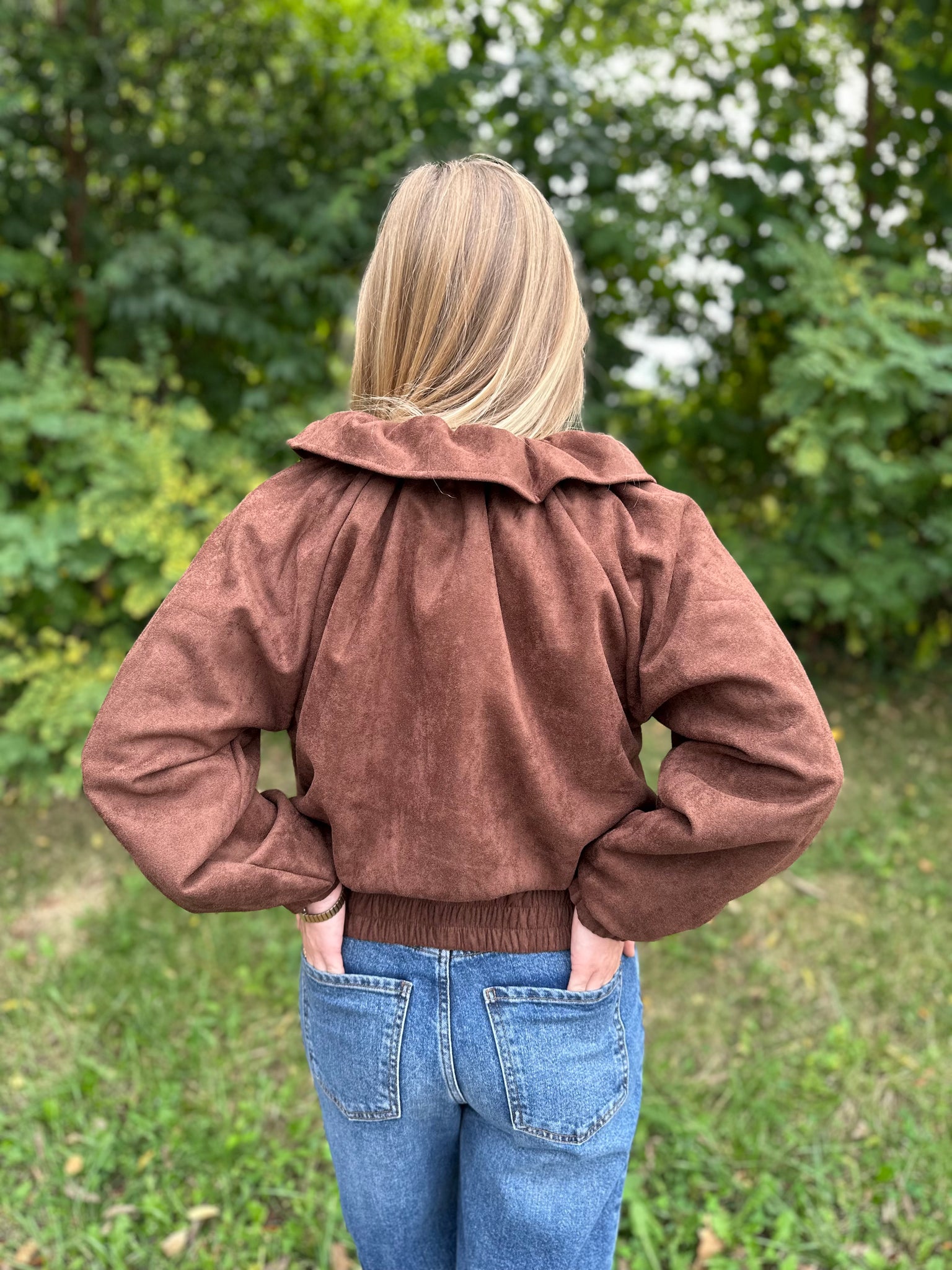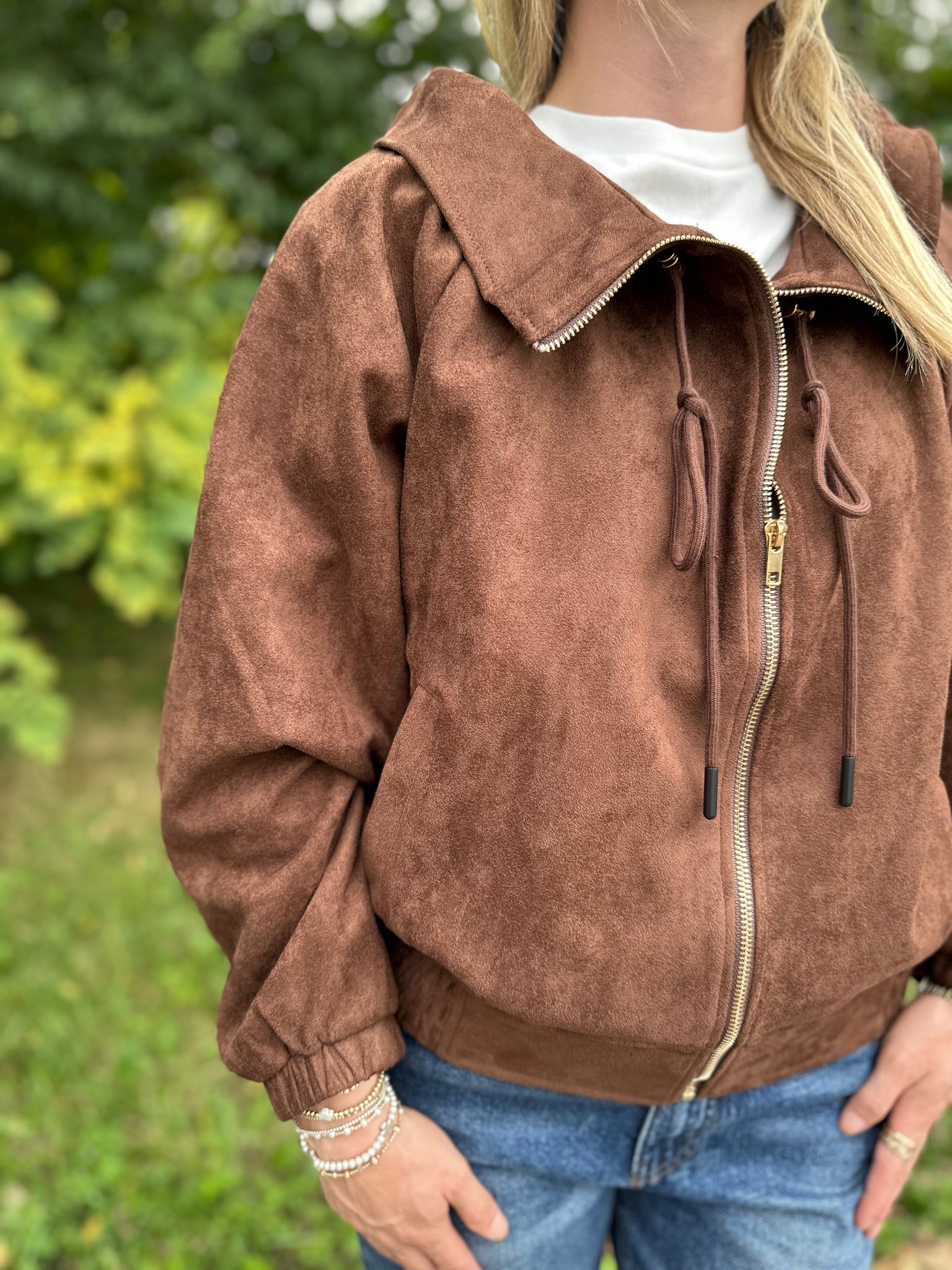 Crafted from soft faux suede, this zip-up jacket features a gold-tone front zipper for a refined finish. Its wide fold-over collar is detailed with a drawstring, offering adjustable style and comfort. Practical side pockets add convenience, while the unlined interior ensures a lightweight, breathable fit ideal for layering.