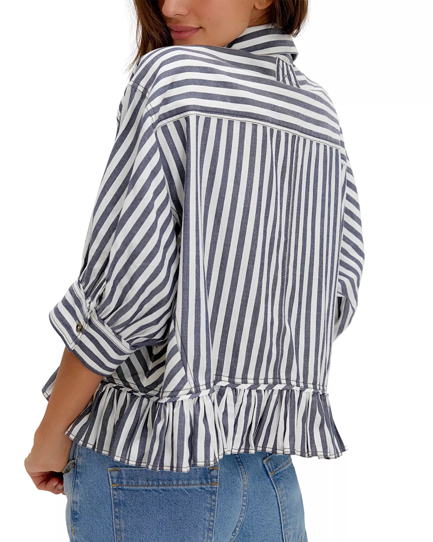 Features: Striped cotton fabrication, collared-neckline, button-front closures, drop-shoulder ¾ sleeves with cuffs, ruffled hem