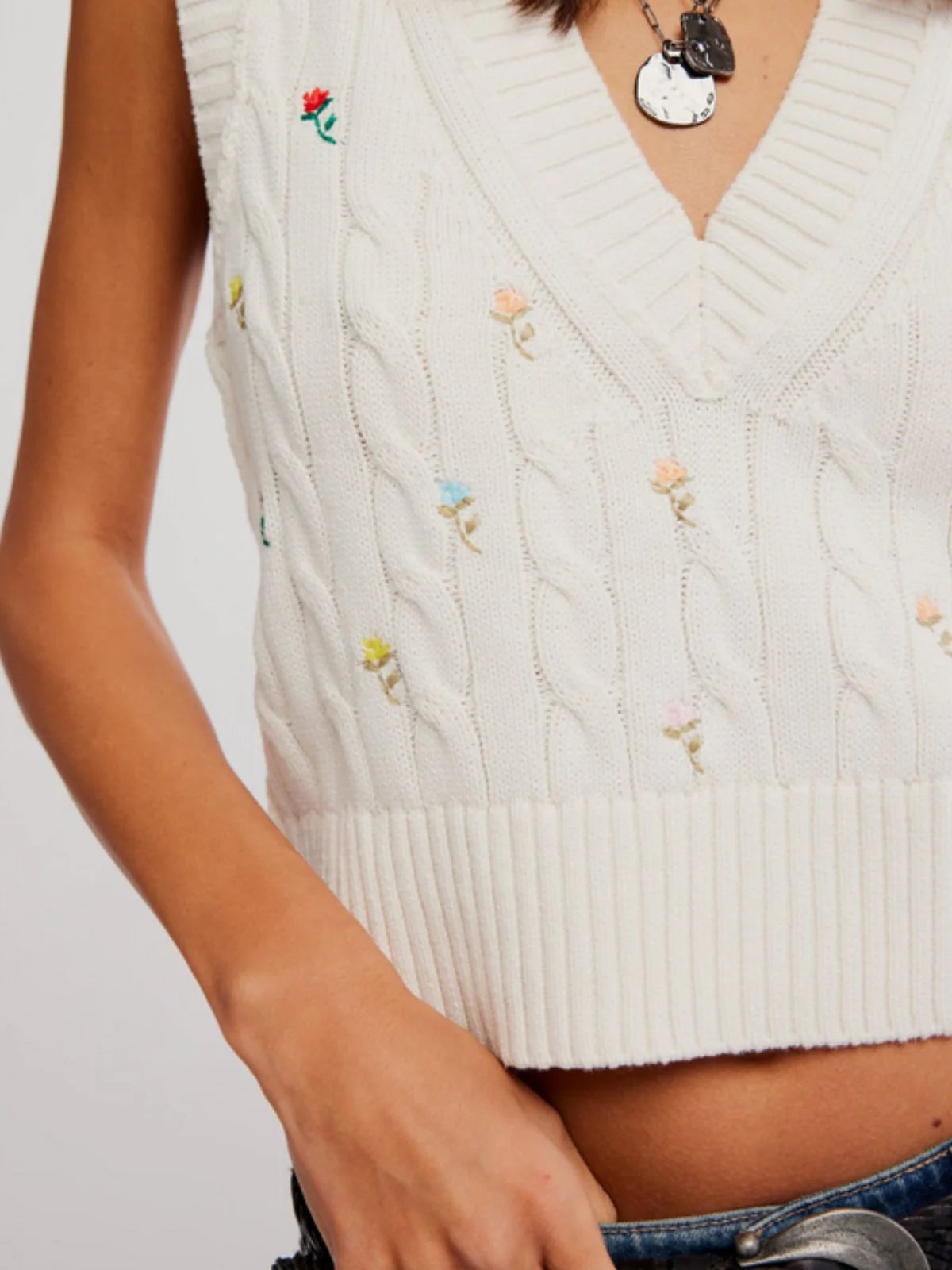 Delicate and feminine with a touch of vintage charm, the Plumeria Floral Vest from Free People is your new go-to layering piece. Featuring a soft cable knit construction with scattered floral embroidery, this sleeveless sweater vest blends cozy texture with a romantic twist. The deep V-neckline and ribbed trim add polish, while the cropped fit makes it perfect for pairing with high-rise jeans or layered over dresses.