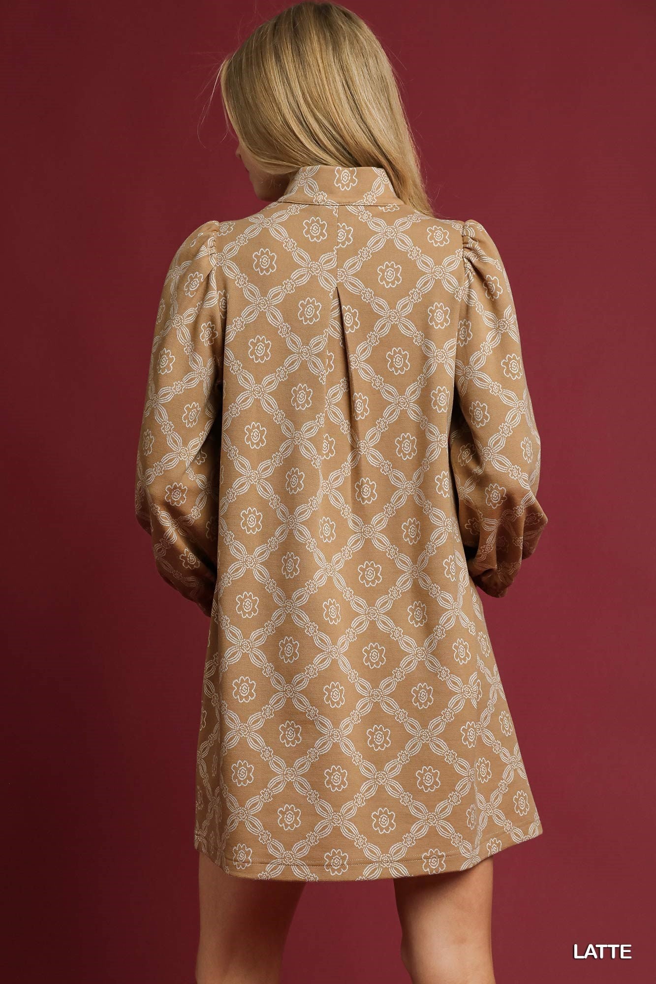 This geometric print mini dress features a split neckline enhanced with striped trim for a subtle contrast. The long puff sleeves end in button cuffs, adding a refined touch to its relaxed, flowy silhouette. Lightweight and unlined, it offers comfortable wear while maintaining a modern, chic look perfect for versatile styling.