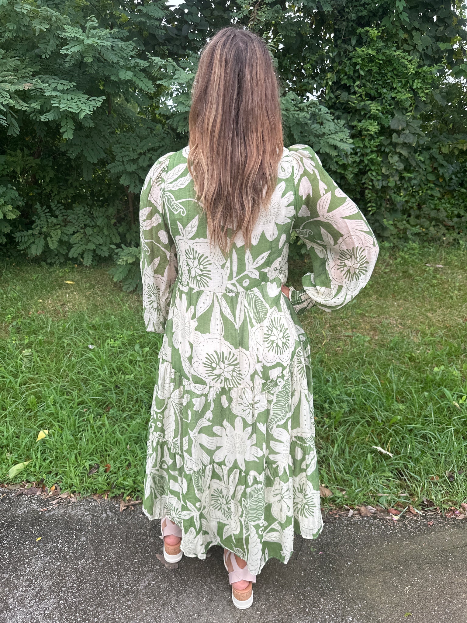 This Green Floral Long Sleeve Tiered Midi Dress features elegant bishop sleeves with delicate ruffle trim and a refined tie detail, combining classic silhouette with modern femininity. The tiered design adds graceful movement, making it an ideal choice for sophisticated occasions or stylish everyday wear. Crafted to balance comfort and style, this dress offers a flattering fit that enhances your natural shape.