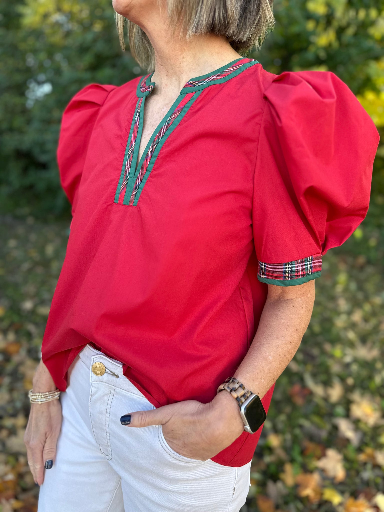 This solid short pleated puff sleeve top is crafted from lightweight woven fabric, offering comfort and breathability. Its unlined design ensures a relaxed fit that is flattering yet easy to wear. The standout contrast accent on the V-neck band adds a subtle, elegant detail to the neckline, making it ideal for styling during the holiday season or any occasion that calls for a refined, polished look. The non-sheer material provides confident coverage, perfect for layering or wearing alone.