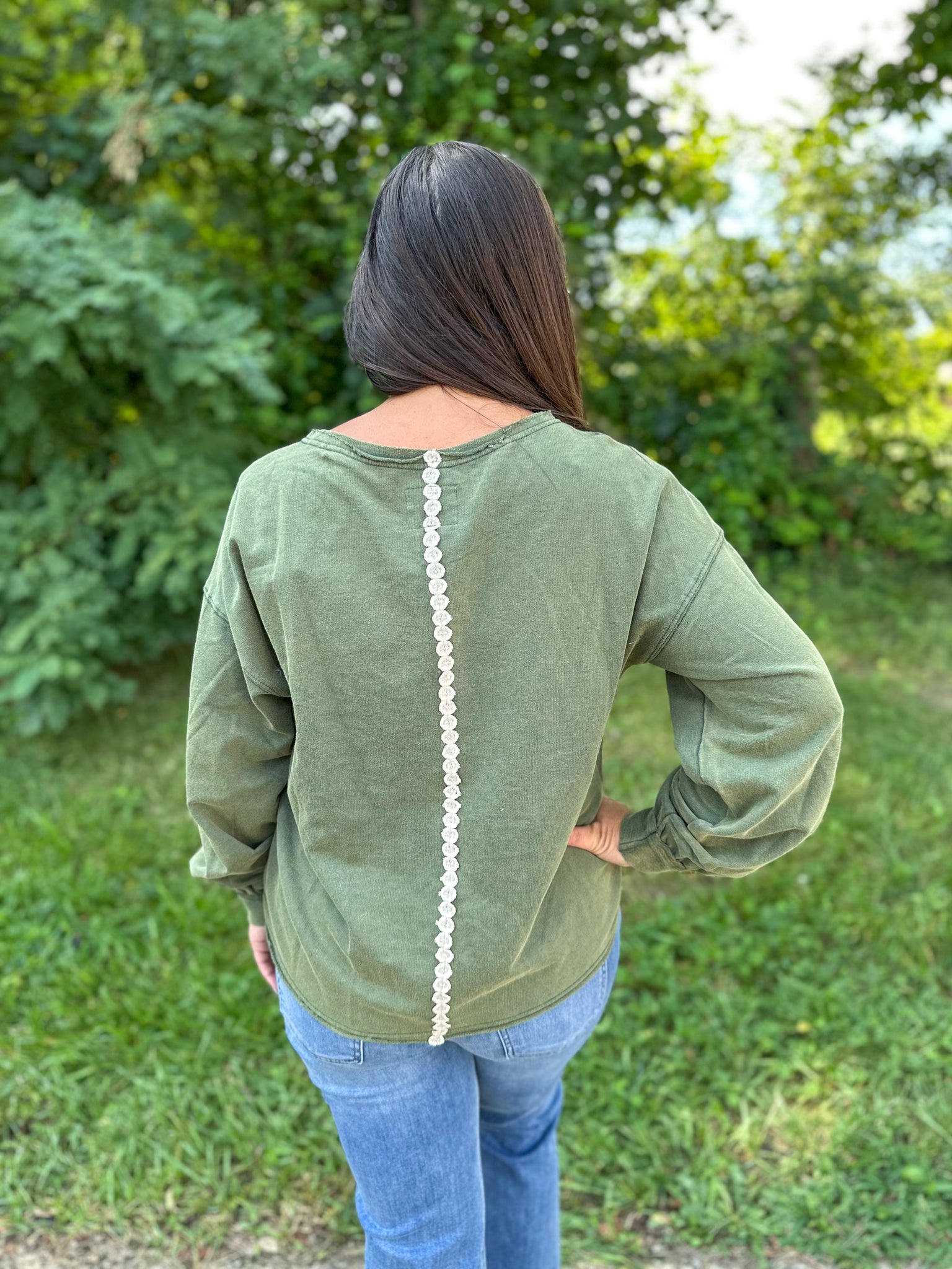 This hunter green long sleeve top combines comfort and elegance with its mineral wash French terry fabric and classic crew neckline featuring a ribbed collar. Delicate lace applique adds a refined touch, while ribbed cuffs on the long sleeves ensure a snug fit. Designed without lining, it offers breathable wear suitable for layering or standalone use. Ideal for those seeking a sophisticated yet casual wardrobe staple.