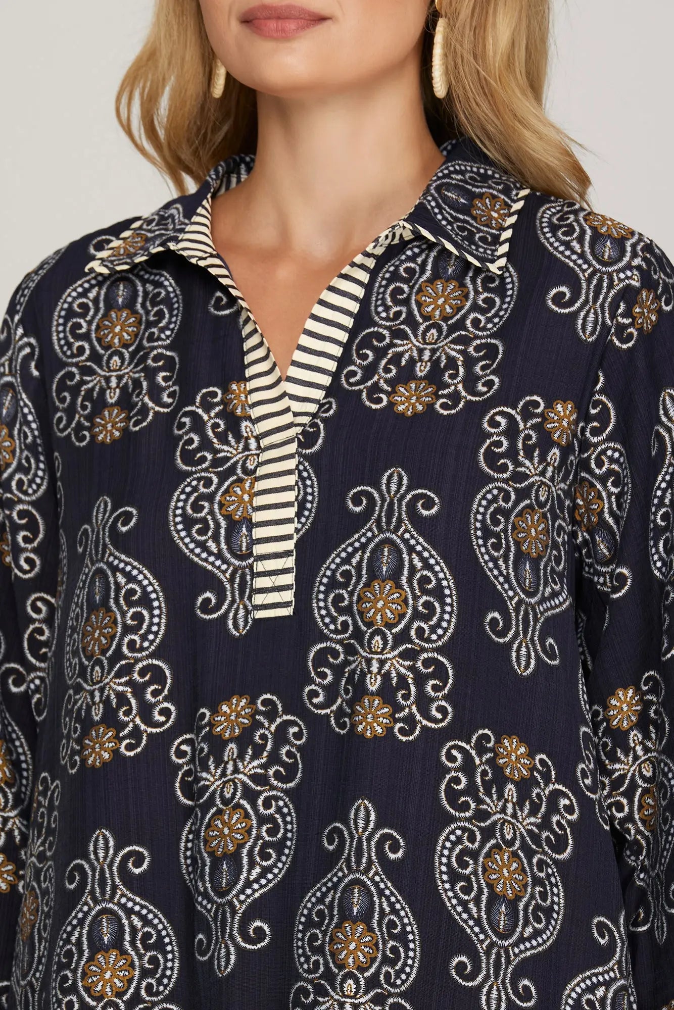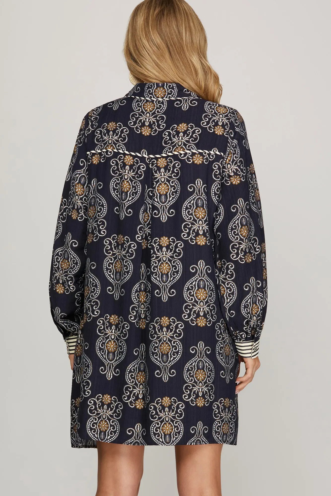 Elevate your wardrobe with this long sleeve navy woven print dress, designed with thoughtful contrast detailing that adds subtle sophistication. Crafted from lightweight, breathable fabric, it offers comfort and ease throughout your day. Functional side pockets blend seamlessly into the silhouette, providing practicality without compromising style. Perfect for both professional settings and casual outings, this mini dress delivers a polished yet effortless look for the modern woman.