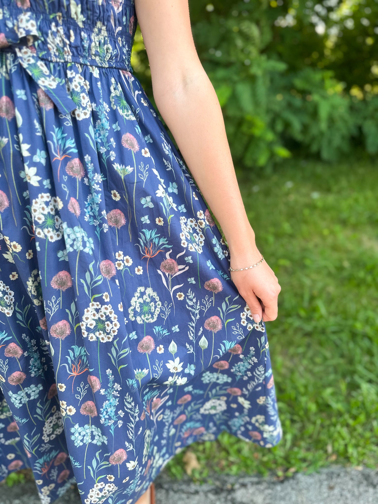 This Midnight Floral Cap Sleeve Dress combines elegance and comfort with its lightweight woven fabric and non-sheer lining. The smocked top with a bow accent enhances the silhouette, while cap puff sleeves add a delicate touch. Designed with practical side pockets and a flattering pullover midi length, this dress offers both style and functionality for versatile wear.