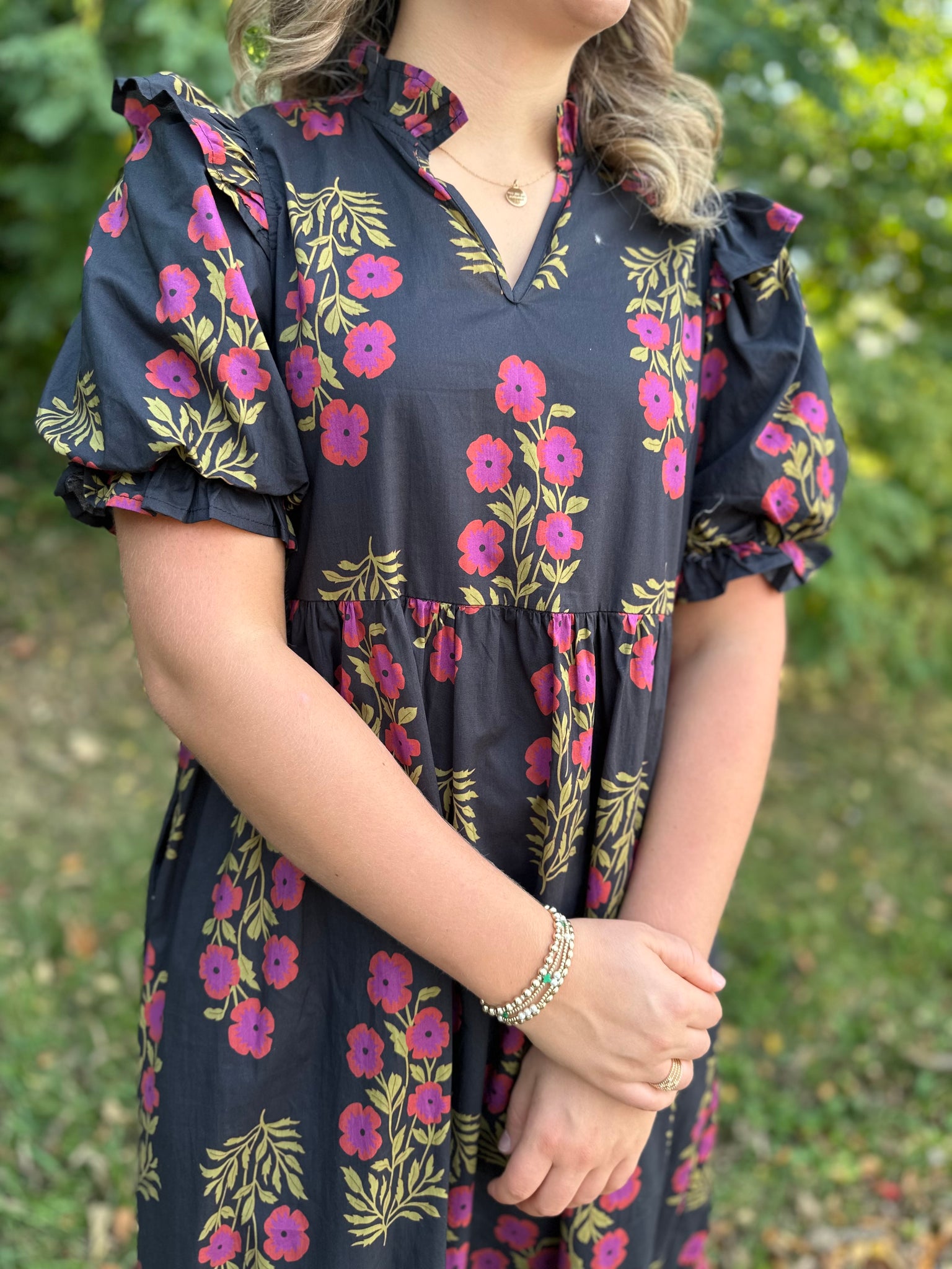 This navy floral print midi dress combines elegant design with practical details. Crafted from lightweight woven fabric, it features short puff sleeves with elasticized ruffle cuffs and shoulder ruffle accents for a refined silhouette. The ruffled trim split neckline adds a delicate touch, while the ruffle hem enhances its feminine flow. Fully lined and non-sheer, it ensures comfortable wear. Side pockets provide added convenience without compromising style, making this dress an ideal choice for both casual and dressy occasions.