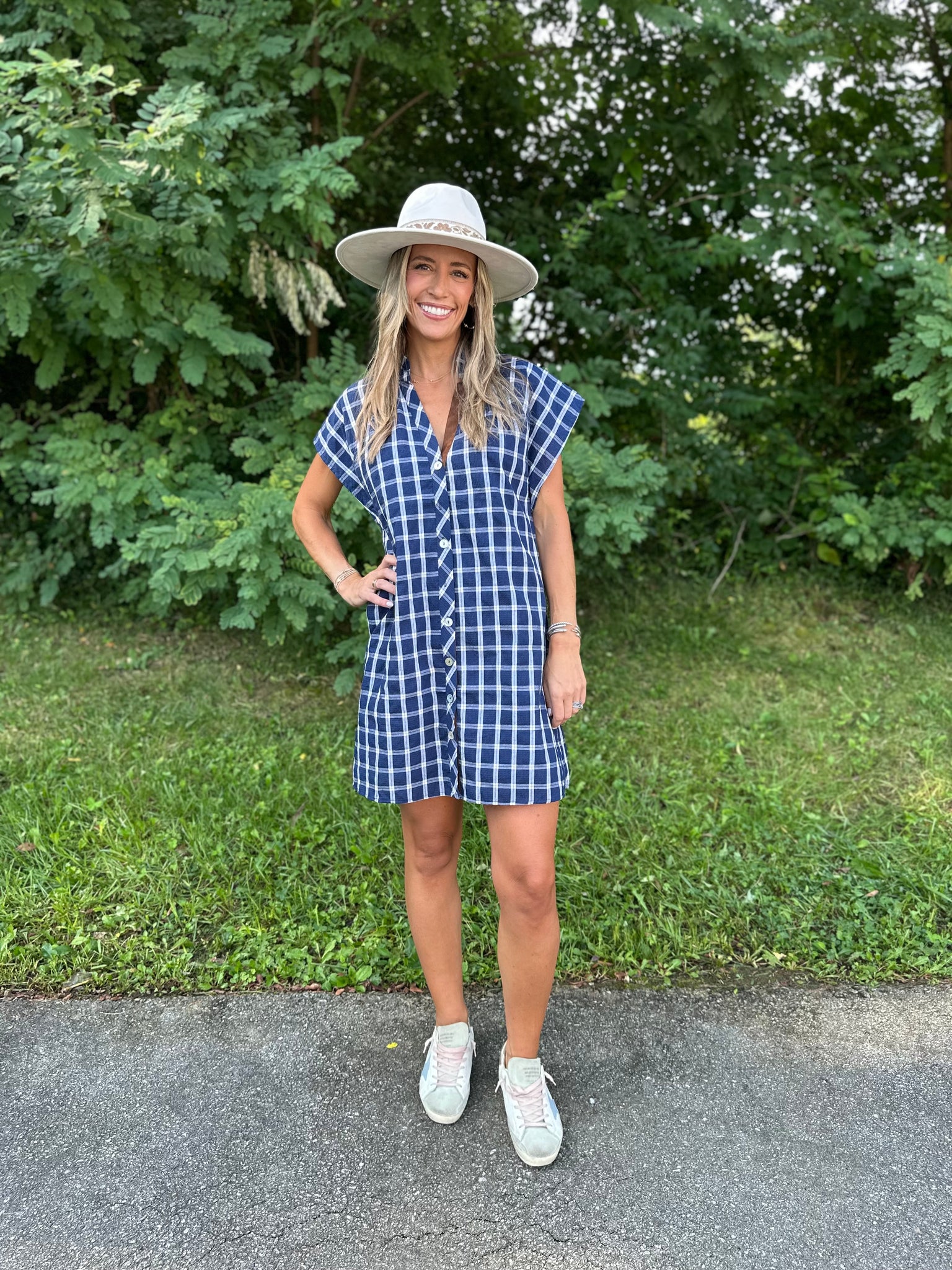 This Navy Gingham Short Sleeve Dress features a relaxed drop shoulder design and a classic button-up front, combining comfort with timeless style. Its lightweight fabric and short sleeves make it ideal for warm weather, while the gingham pattern adds a refined, versatile touch suitable for both casual and semi-formal occasions.