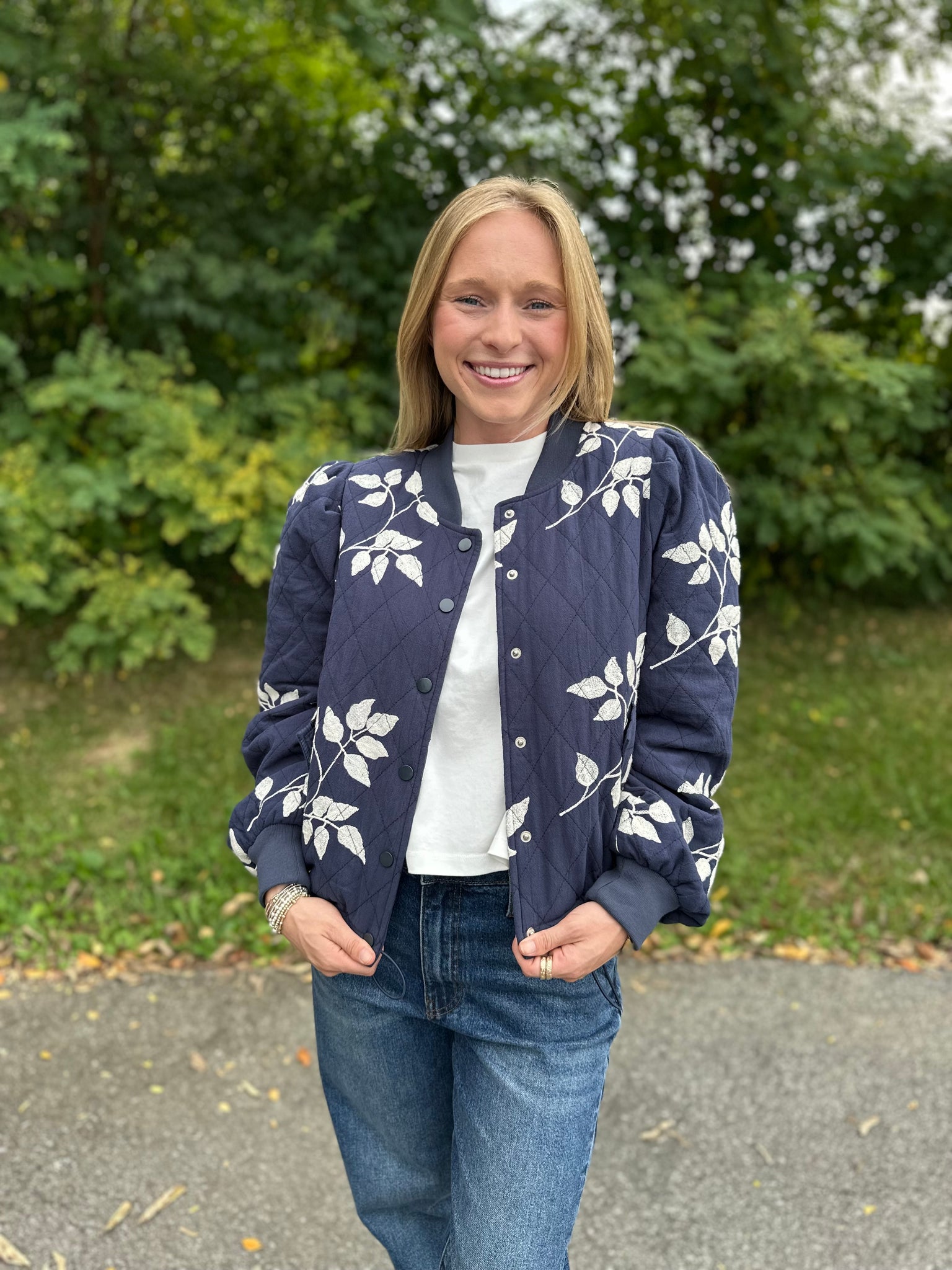 This navy quilted jacket features intricate leaf embroidery that adds a refined texture to its relaxed fit silhouette. Designed with a round neckline, long sleeves, and a classic button-down front with collar, it offers both style and comfort. The non-stretch fabric ensures durability while maintaining a polished appearance, making it an ideal layering piece for cooler days.