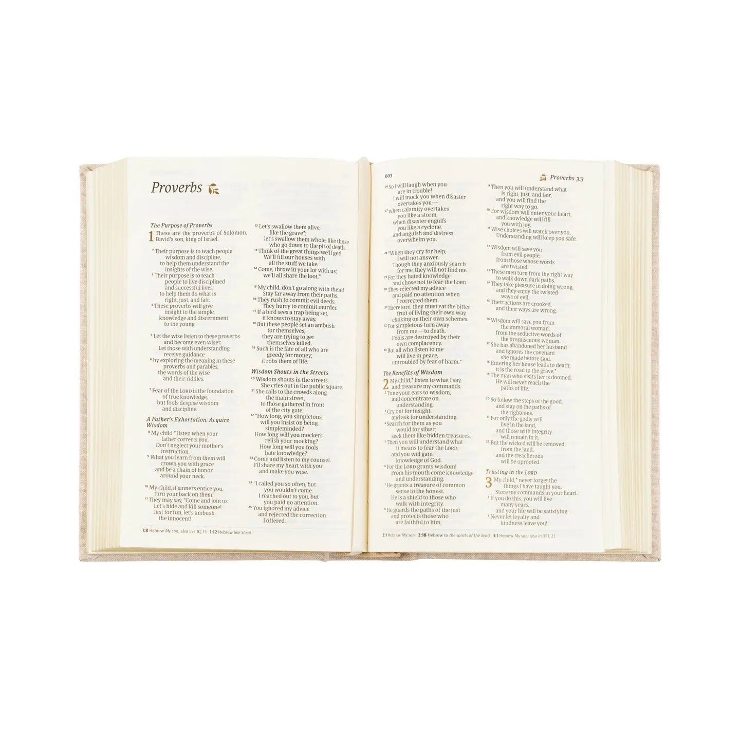 This embroidered, NLT Compact Bible features our Casablanca design. The back cover includes a gold-foiled verse, Hebrews 4:16: “Come boldly to the throne of grace.”Our Compact Bibles are designed for life on the go—perfect for church, Bible study, or everyday errands.