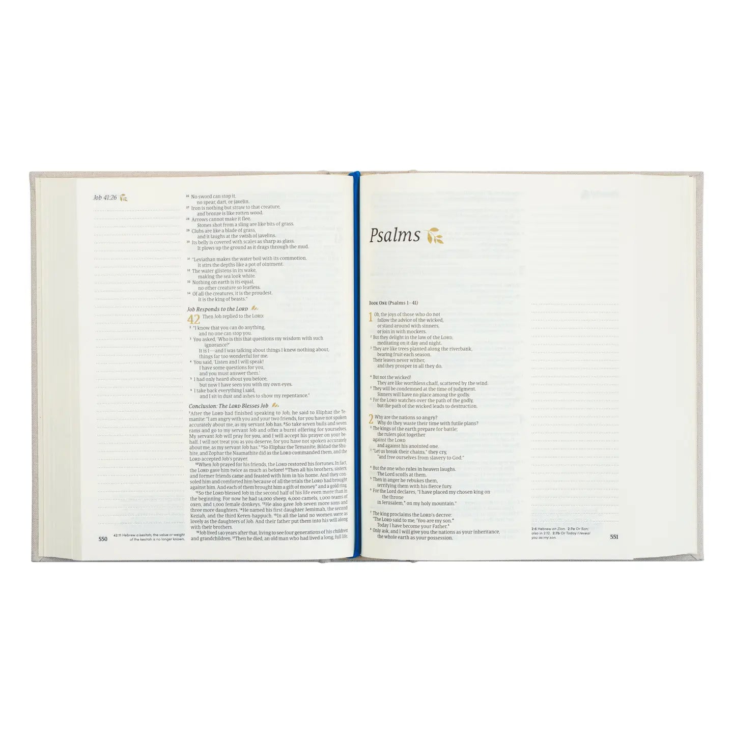 Product Details - Translation: New Living Translation - Format: Cloth-over-board, hardcover; with our original Hosanna Revival typeset - Page layout: single-column text, 2" lined notetaking margins - Cream-colored Bible paper - Two satin ribbon markers - Smyth-sewn binding - Jesus' words in black - Font size: 8pt - Page count: 1,376 - Dimensions: 8.5” x 6.75” x 1.75” - Weight: 41oz
