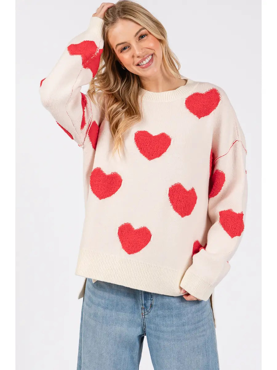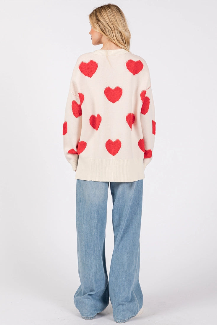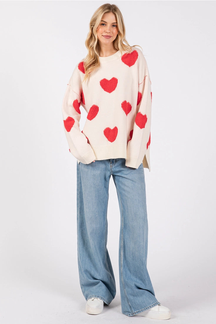 This playful and cozy sweater is designed with an oversized silhouette and soft knit texture, perfect for creating a relaxed yet charming look. Featuring bold heart motifs throughout and subtle side slits for added movement and comfort, this sweater makes a sweet statement for Valentine's season and beyond. Its drop-shoulder design and loose fit make it ideal for layering over your favorite jeans or leggings for a cute and effortless outfit. Valentine sweater, heart sweater, oversized knit, side slit top, cozy pullover, romantic outfit, casual layering piece, holiday sweater, soft knitwear, statement sweater, cute heart print