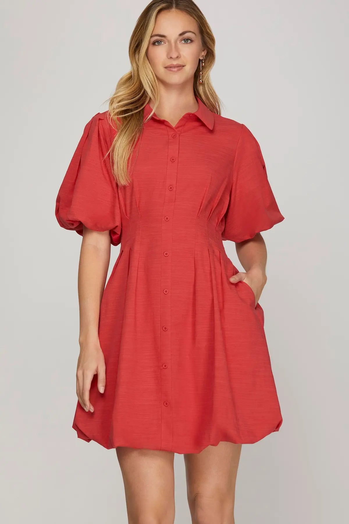 Elevate your everyday style with this charming balloon mini dress, designed with romantic puff sleeves and a classic button-down front. The fitted back features delicate smocking for a flattering silhouette, while functional pockets add practical appeal. Crafted from quality woven fabric, this versatile piece transitions seamlessly from casual outings to weekend gatherings. Perfect for creating effortless, polished looks with minimal styling effort.