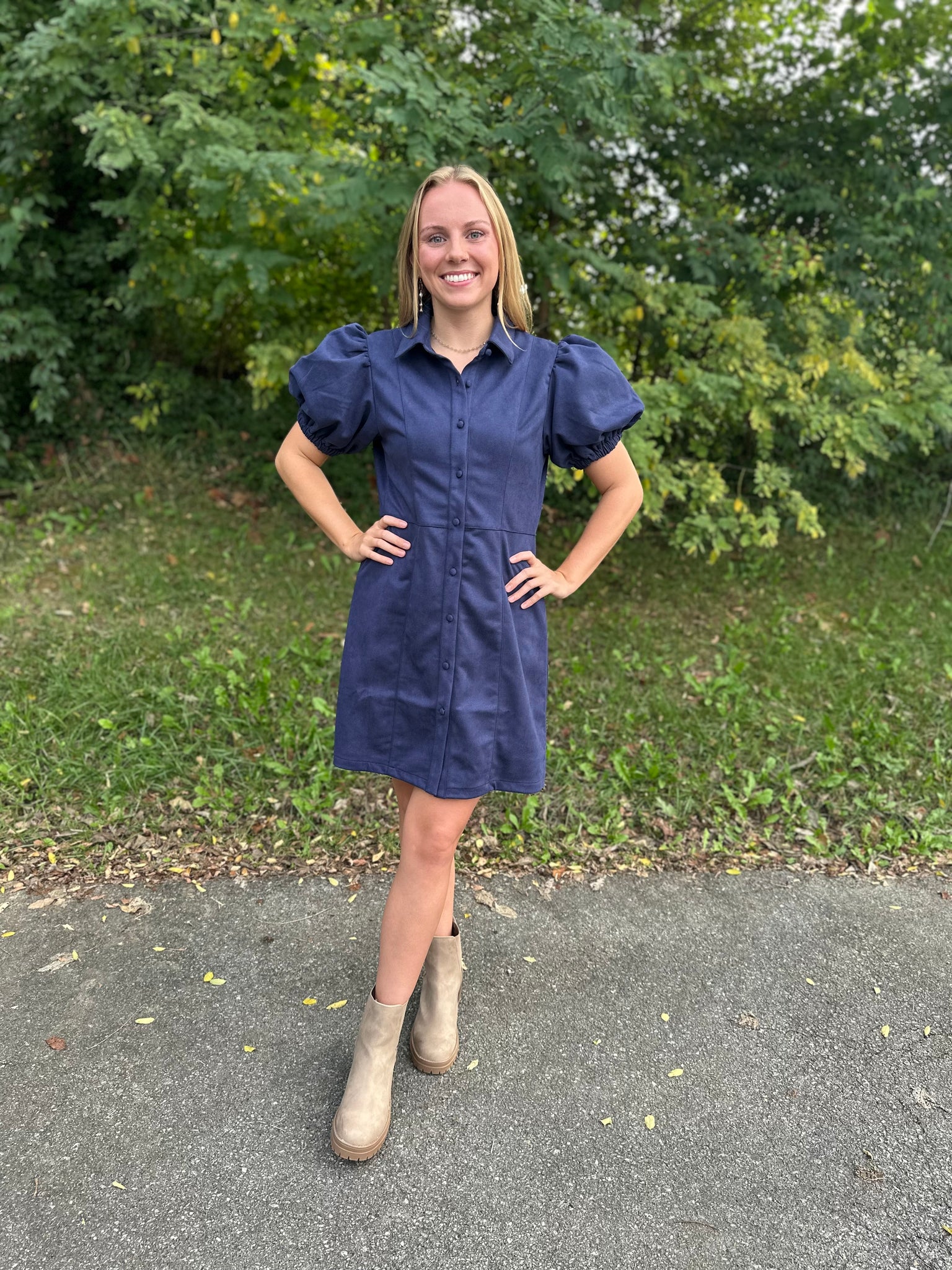 The Puff Sleeve Button Up Suede Dress combines classic tailoring with a contemporary touch, featuring structured puff sleeves and a sleek button-up front. Crafted from soft suede, it offers a luxurious texture that enhances both comfort and style. Perfect for transitioning seamlessly from day to evening wear, this dress provides a flattering silhouette with a refined edge, highlighting expert attention to detail in every stitch.