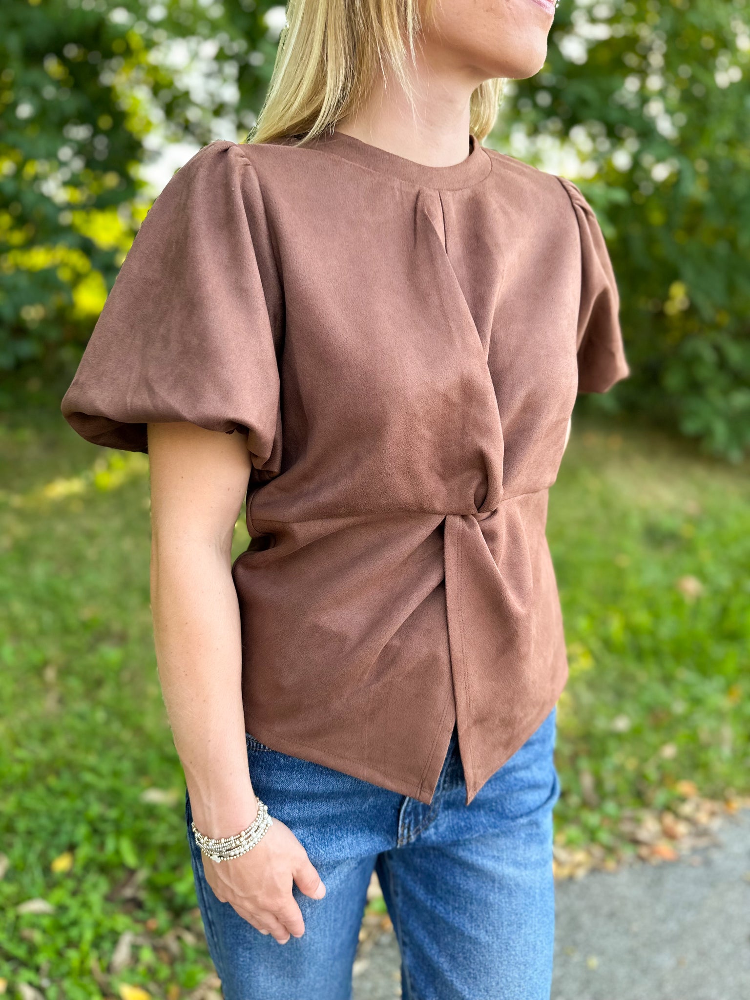 Elevate your wardrobe with the Puff Sleeve Twisted Detail Suede Top, expertly crafted to combine contemporary style with sophisticated texture. Featuring voluminous puff sleeves and a distinctive twisted front design, this suede top offers a flattering silhouette and tactile richness. Ideal for layering or wearing solo, it adds a refined, fashion-forward touch to both casual and formal ensembles.