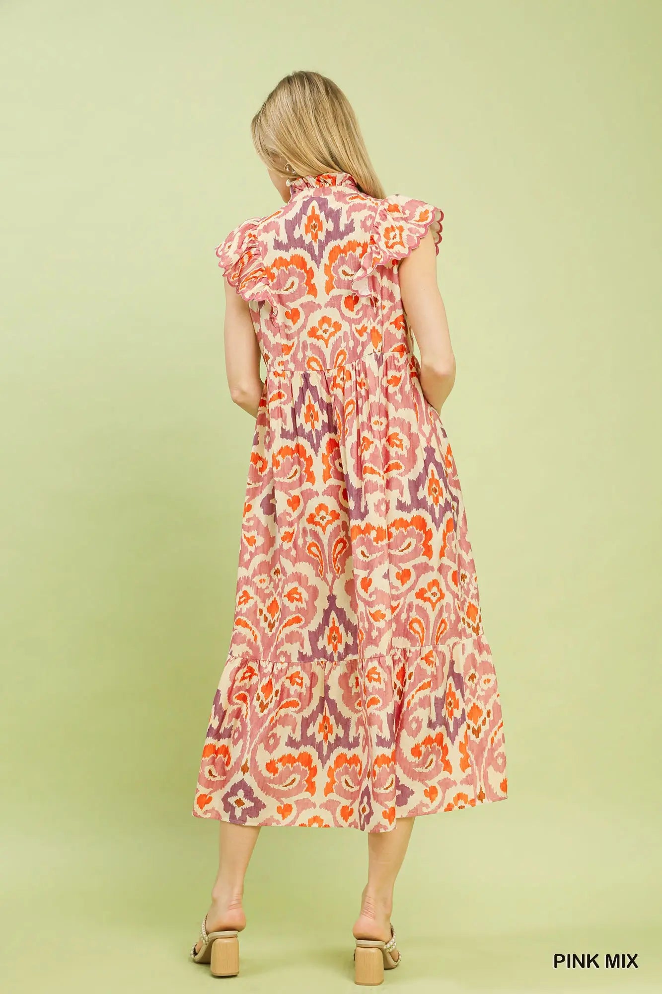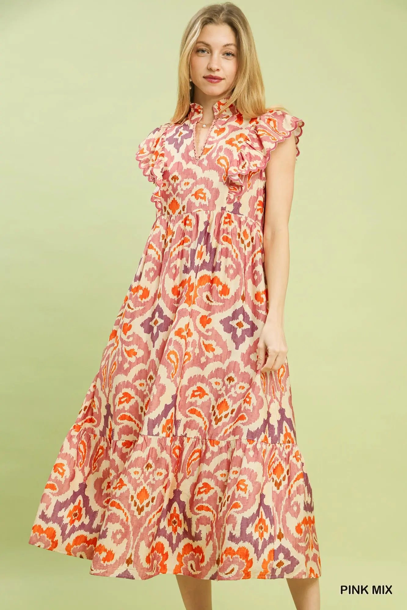 Elevate your wardrobe with this sophisticated tiered midi dress, designed to flatter and inspire confidence. The split V-neck creates an elegant neckline while delicate scalloped edges add refined detail throughout. Voluminous ruffle sleeves bring movement and dimension to your silhouette, striking the perfect balance between statement-making and wearable elegance. A fully lined skirt ensures comfort and opacity, allowing you to move freely from day to evening. This versatile piece transitions seamlessly across seasons and occasions, offering timeless style with contemporary flair.