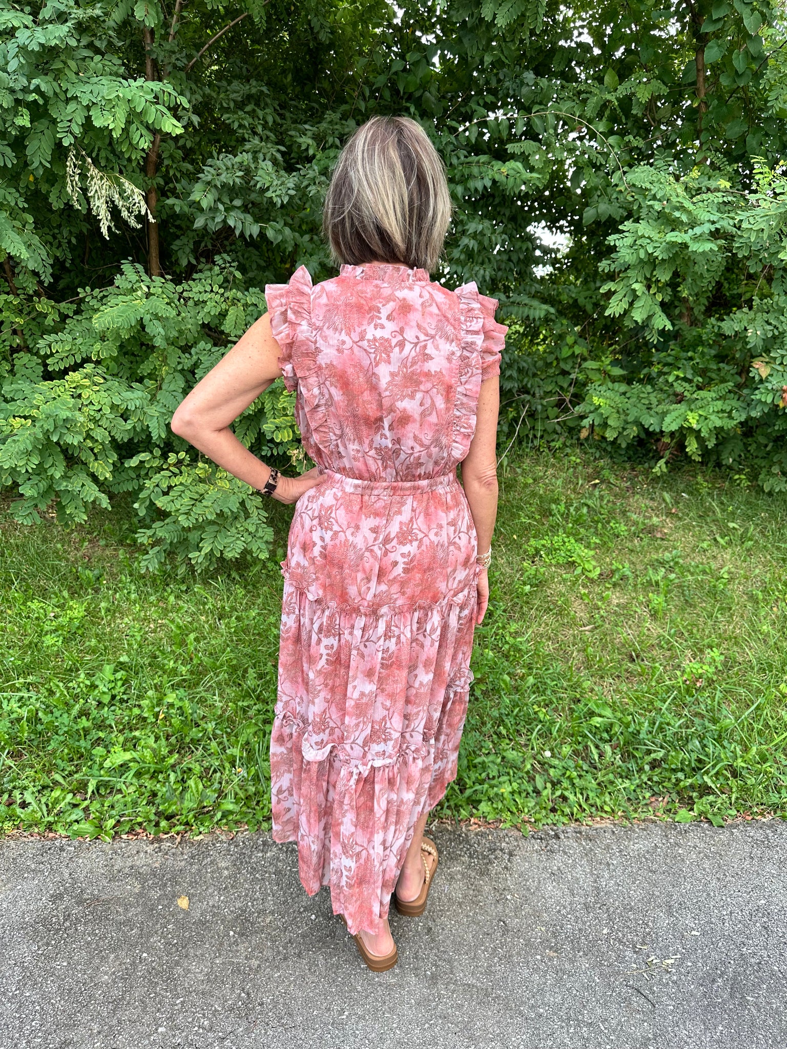 This Rust Floral Print Tiered Mid Dress features a flattering V-neckline and delicate ruffled details at the neck and sleeves, adding subtle texture and elegance. The self-tie waist allows for a customizable fit, enhancing your silhouette while maintaining comfort. Its tiered design offers graceful movement, making it a versatile choice for both casual and dressier occasions.