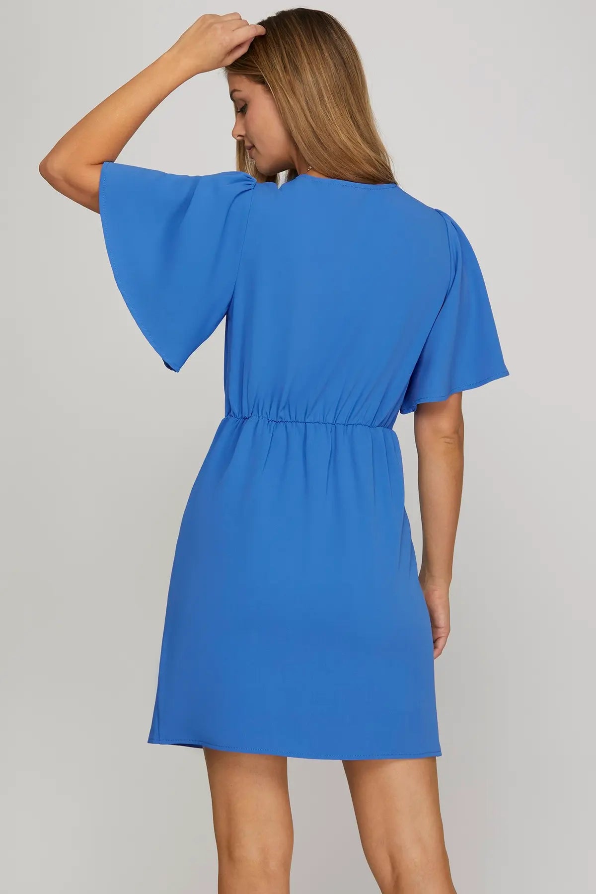 Effortlessly chic and playfully feminine, this short sleeve wrap dress features delicate ruffled detailing that adds movement and dimension. The mini silhouette flatters with a classic wrap design, while the lined skirt ensures comfort and confidence. Perfect for casual outings, brunch dates, or transitional spring styling. The woven fabric drapes beautifully, making this versatile piece a wardrobe essential that works from day to evening.