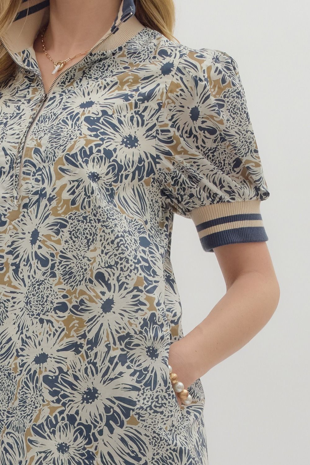 This Slate Floral Print Puff Sleeve Mini Dress combines a delicate floral design with thoughtful details for a polished look. Crafted from lightweight woven fabric, it features a front zipper and multicolor ribbed trim, adding subtle contrasts. The dress is fully lined and non-sheer, ensuring comfort and coverage, while side pockets offer practical convenience. Its short puff sleeves and mini length create a flattering silhouette, making it an elegant choice for warm-weather occasions.