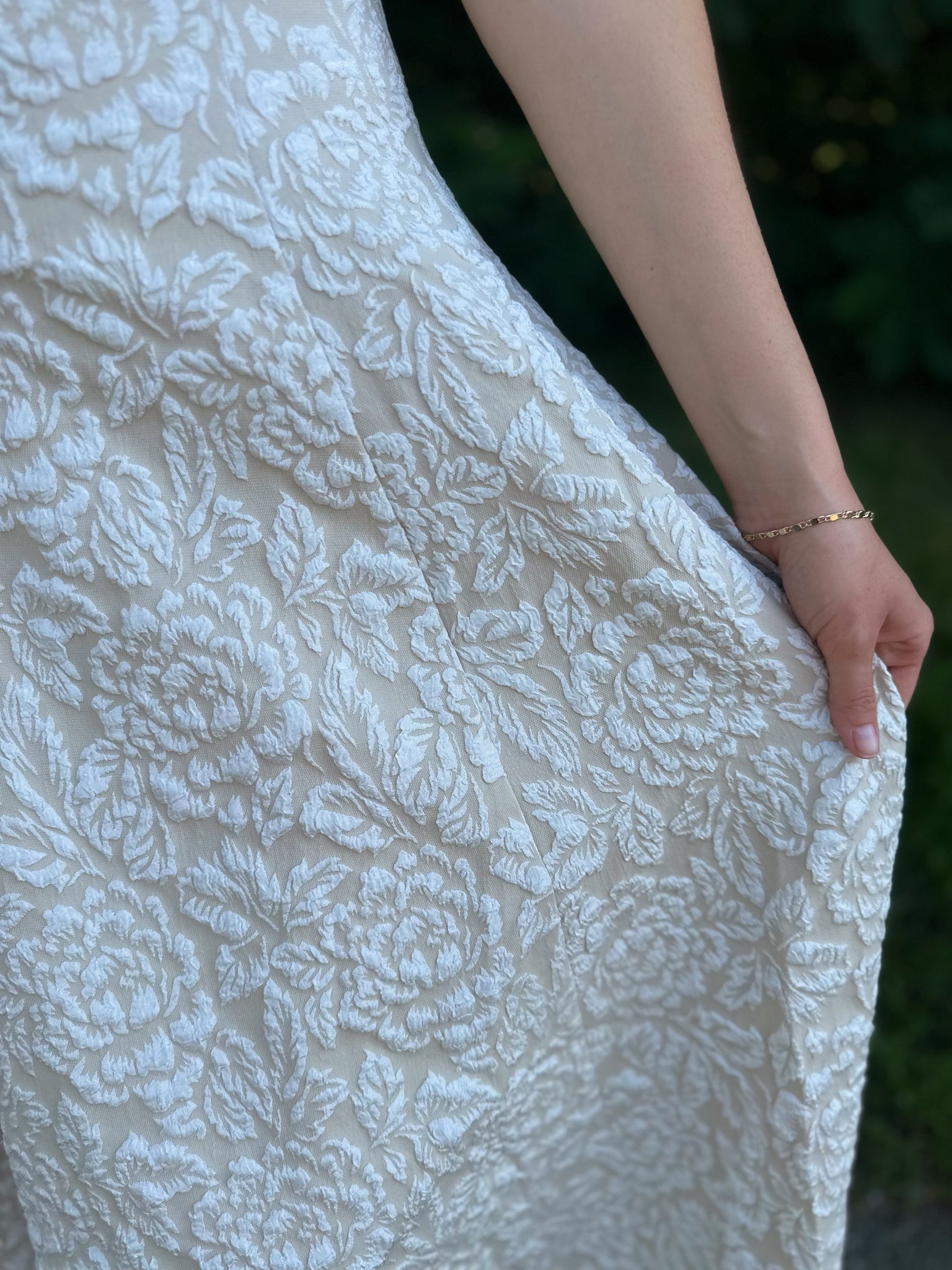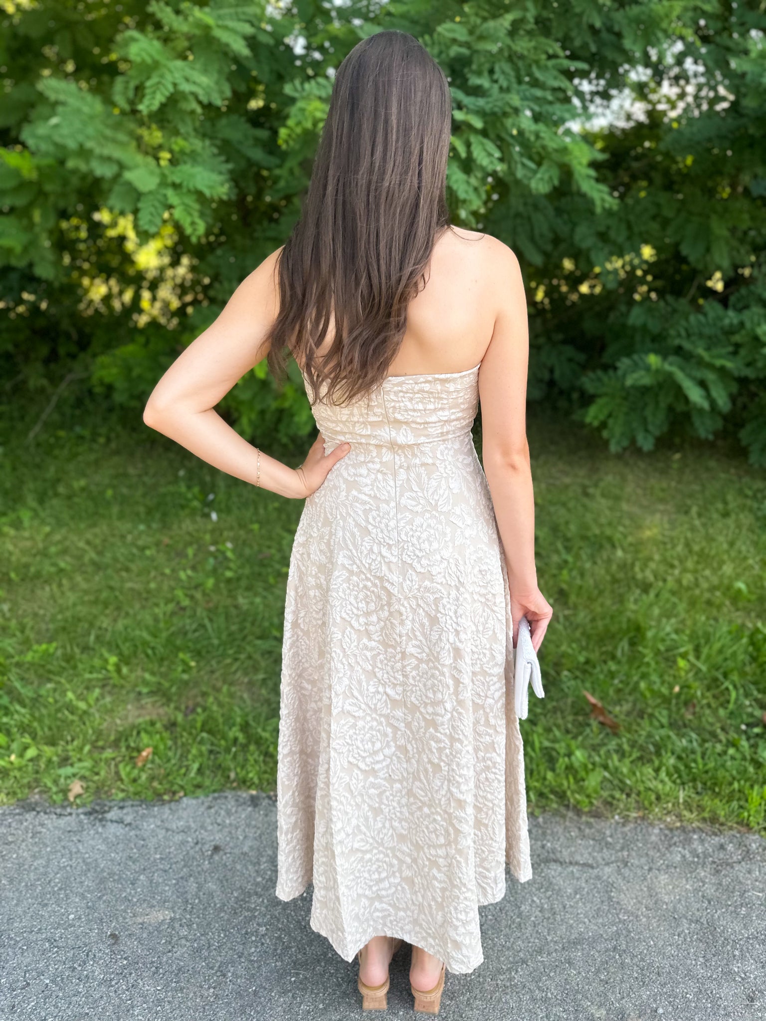 This expertly crafted midi dress showcases a textured woven fabric with a flattering strapless sweetheart neckline that enhances the décolletage. Its elegant circle skirt offers graceful movement and a timeless silhouette, while the discreet back zipper ensures a smooth, secure fit. Ideal for sophisticated occasions, this dress combines classic design with refined detailing