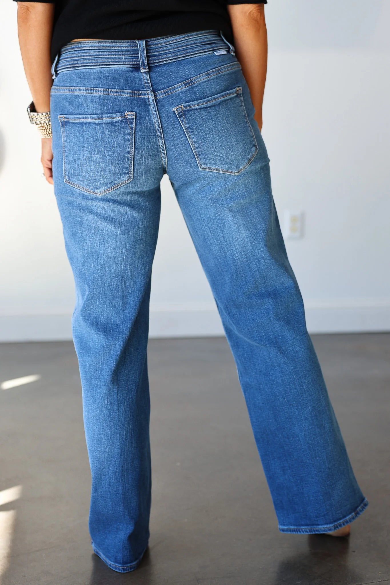 Designed with a flattering mid-rise waist and a unique double-button closure, these jeans provide a secure and comfortable fit that subtly shapes. The classic bootcut leg gracefully widens from the knee, creating a balanced silhouette that pairs beautifully with your favorite boots, heels, or even flats. Experience denim perfection that moves with you and maintains its shape throughout the day.