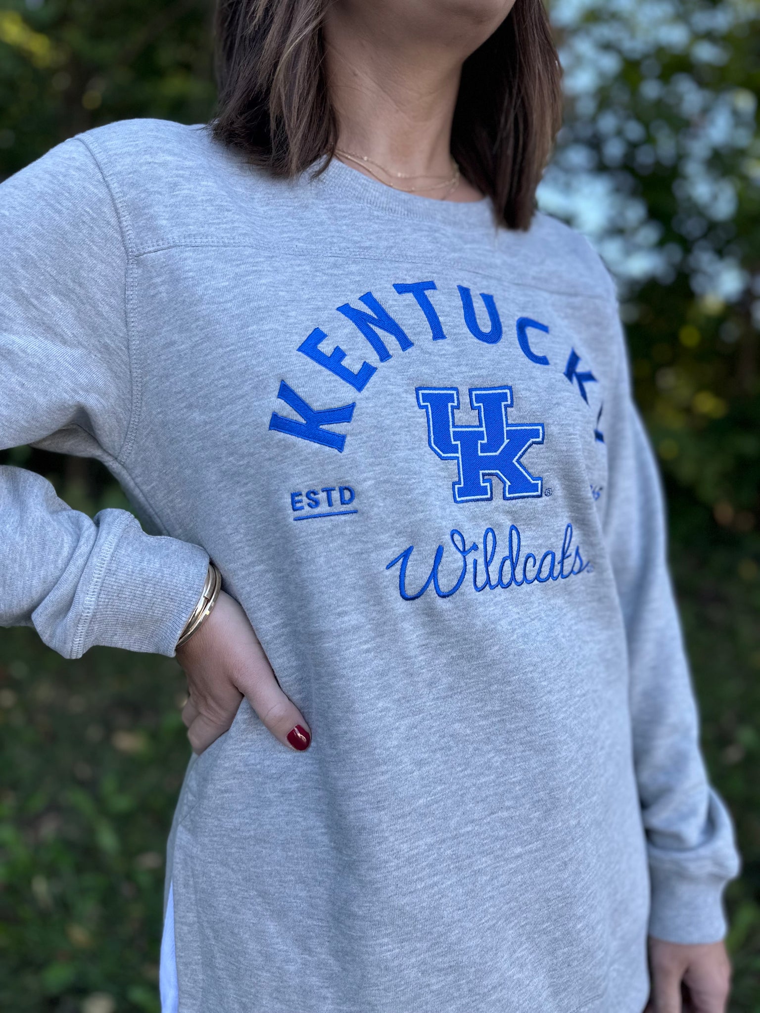 Stay comfortable and showcase your Kentucky pride with the University of Kentucky Back To Basics Tunic Sweatshirt in heather grey. Crafted from soft, breathable fabric, this sweatshirt offers a relaxed fit with a longer tunic silhouette for versatile styling. Its classic design pairs well with casual or athleisure looks, providing warmth without bulk. Ideal for game days or everyday wear, this piece balances comfort and collegiate spirit with understated elegance.
