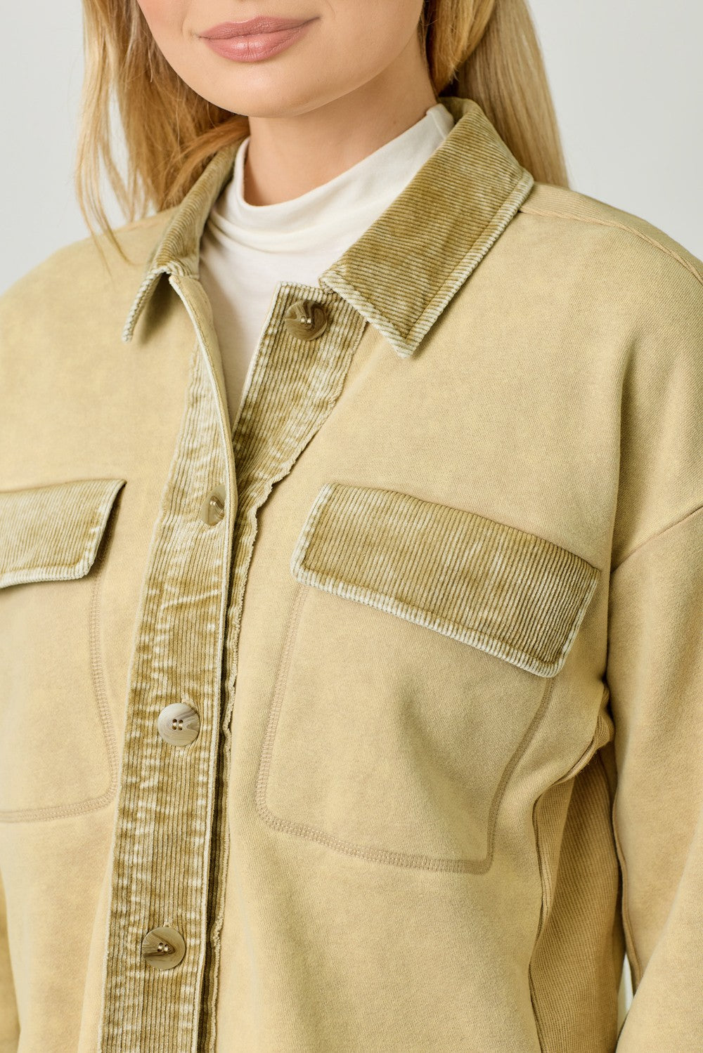This Washed Terry Cropped Jacket combines practical chest pockets with long sleeves for balanced coverage and utility. Thoughtful corduroy detailing adds texture and visual interest, enhancing the jacket’s durability and style. Ideal for layering, it delivers both comfort and a refined look suitable for various settings.