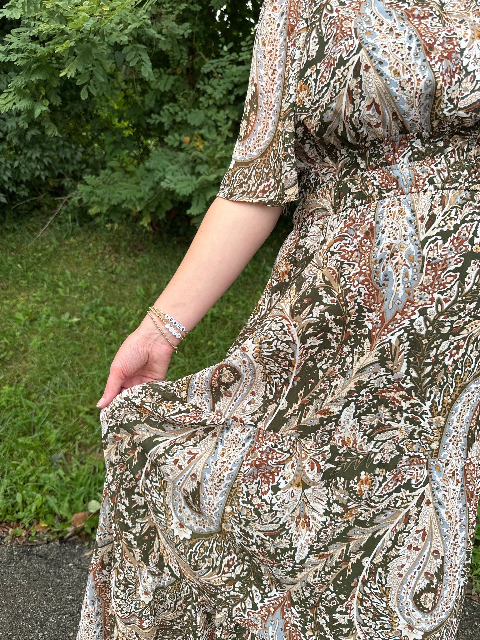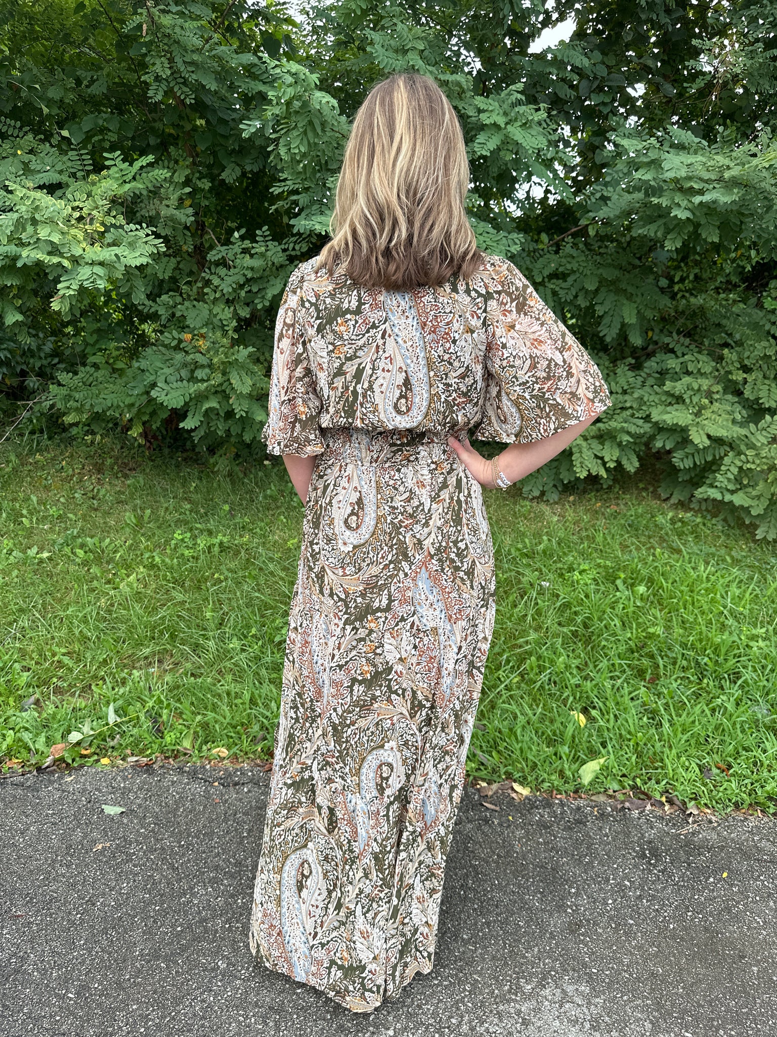This woven maxi dress features a half flutter sleeve design and a tiered silhouette, crafted with a full lining for comfort and coverage. The cinnamon print adds a warm, versatile touch, while practical pockets enhance functionality. Please note, the belt is not included. Ideal for effortless style with expert tailoring details.