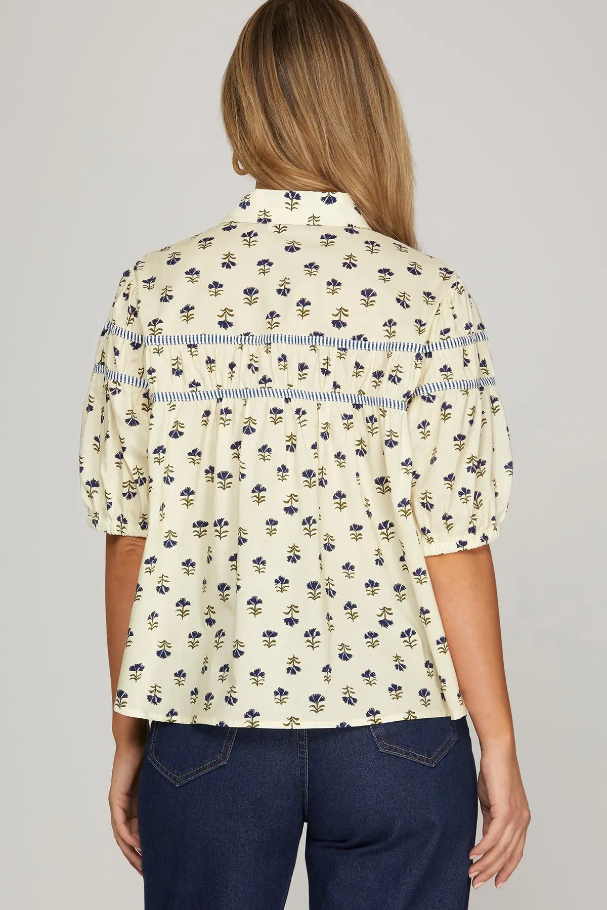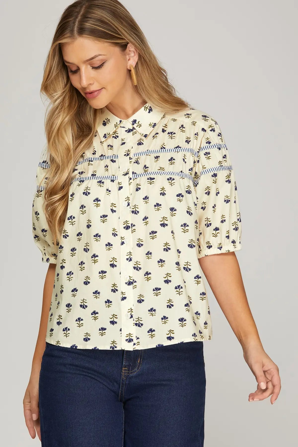 Elevate your everyday wardrobe with this charming woven print button-down blouse. Featuring distinctive half puff sleeves that add a touch of feminine flair, this top combines classic tailoring with modern style. The intricate print brings visual interest, while contrast binding details along the edges create a polished, intentional finish. Perfect for layering or wearing solo, this versatile piece transitions seamlessly from office to weekend outings. Crafted from quality woven fabric for comfortable all-day wear.